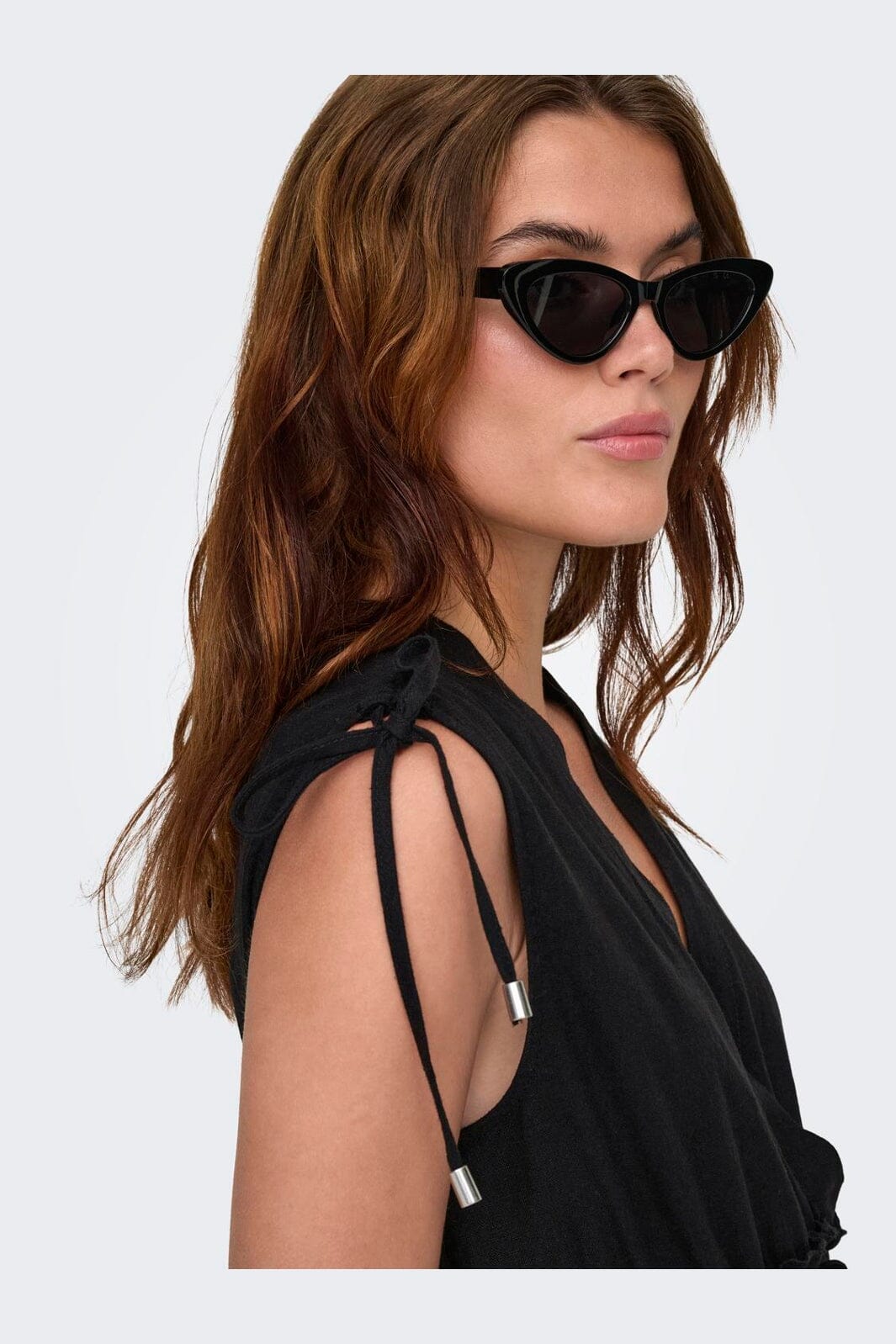 Longue robe noire de Only, confectionnée dans un mélange de viscose et de lin. La robe présente un col en V, est sans manches et possède un cordon de serrage à la taille.