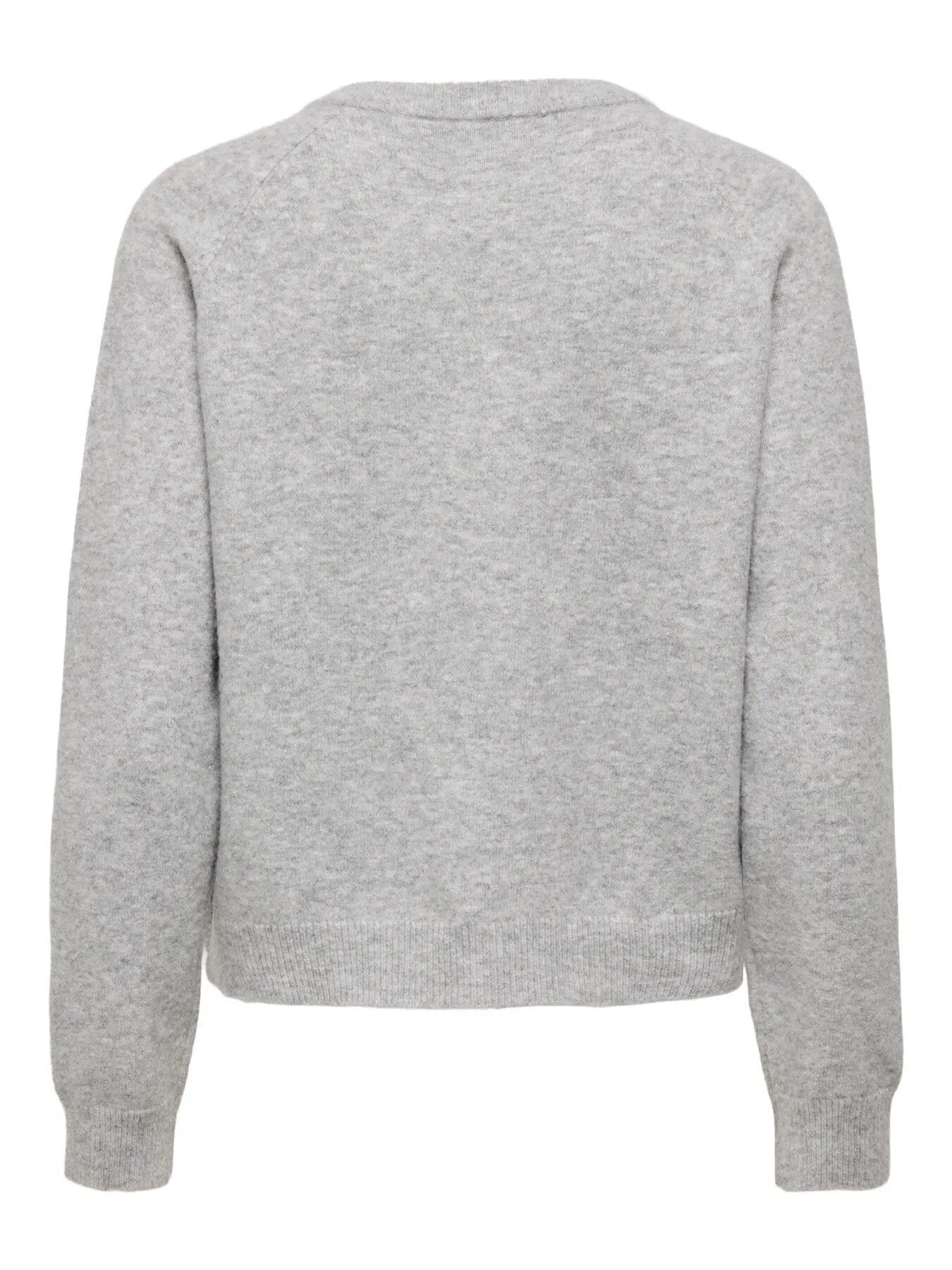 Cardigan gris clair de la marque Only avec des boutons en forme de nœud de couleur argentée. Le cardigan possède un col rond et est confectionné en maille fine.