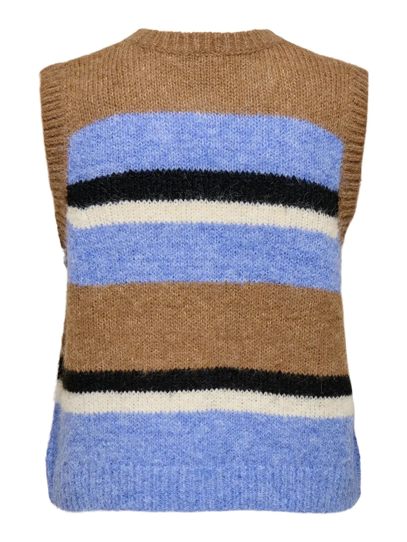 Gilet rayé de Only avec de larges rayures horizontales en brun, bleu clair, noir et blanc. Le gilet a des boutons noirs et un col rond.