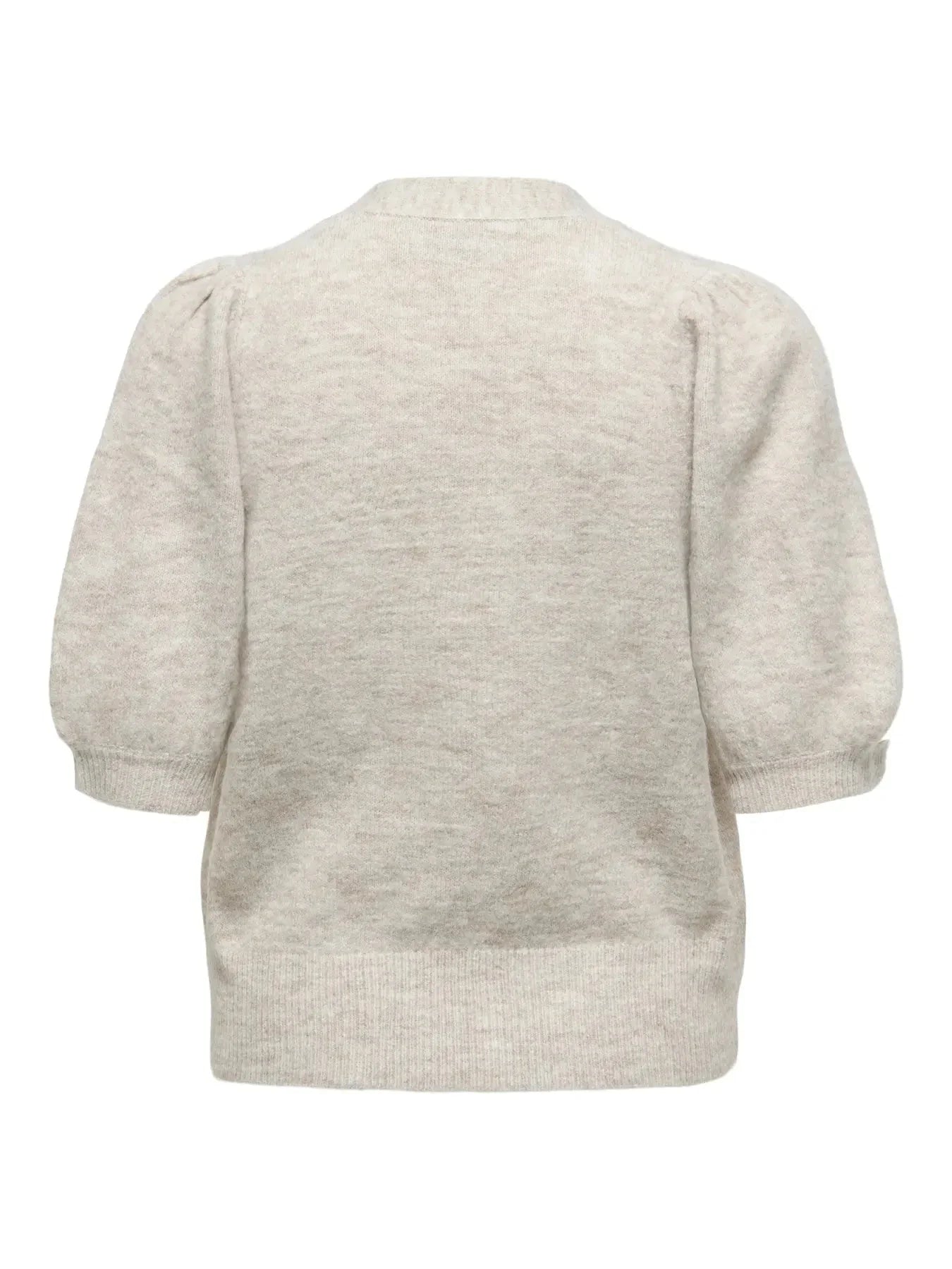 Cardigan de chez Only dans une couleur beige clair chinée. Il possède des manches courtes légèrement bouffantes et une fermeture boutonnée sur le devant.