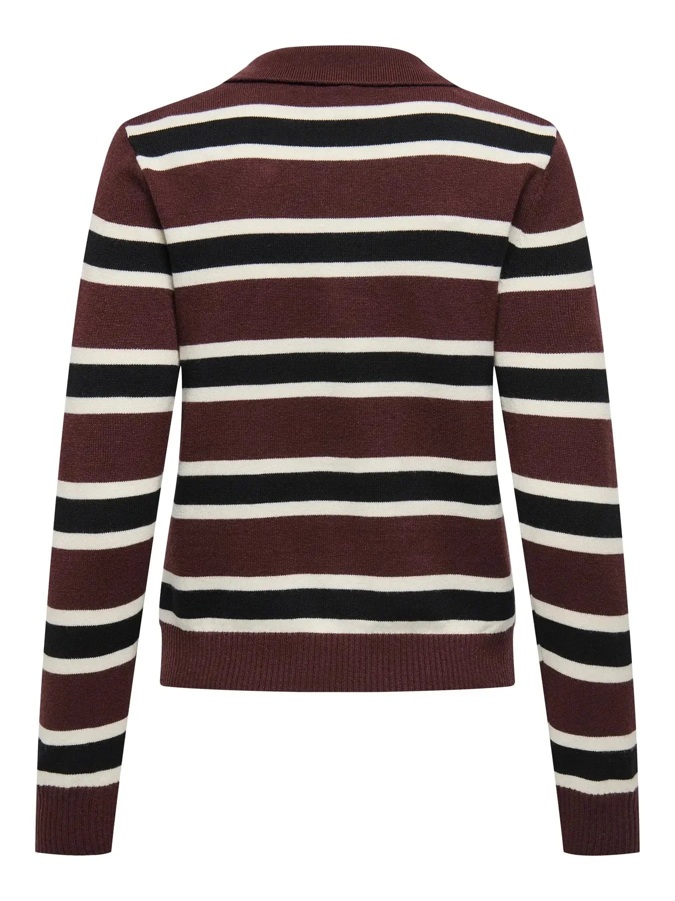 Pull polo rayé de Only dans des nuances de brun et de bordeaux avec des rayures noires et blanches. Le pull a un col polo et des manches longues.