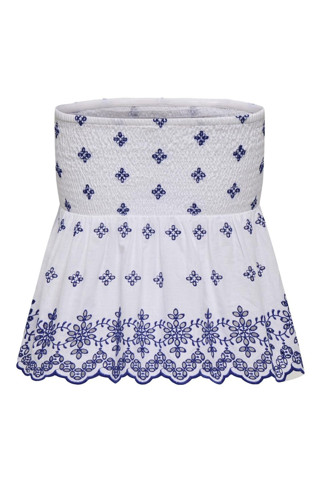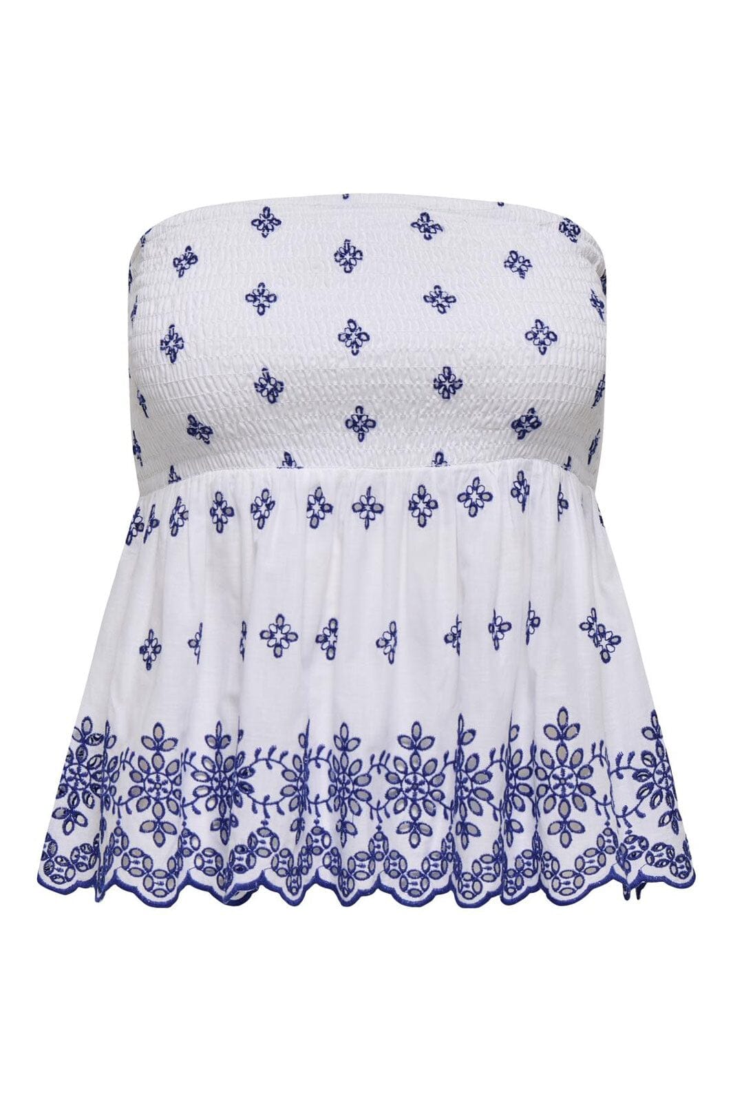 Top bandeau de Only en blanc avec broderie bleue. Le haut a des détails smock en haut et des bords ondulés en bas. Le modèle sans bretelles a un motif floral et une coupe régulière.