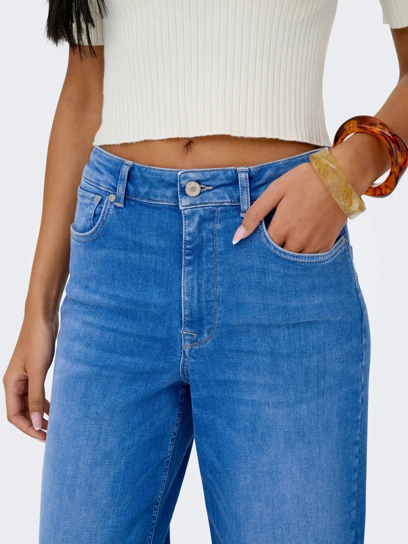 Jean large de Only dans une nuance de denim bleu vif. Le jean a une taille haute et une coupe ample avec des jambes larges.