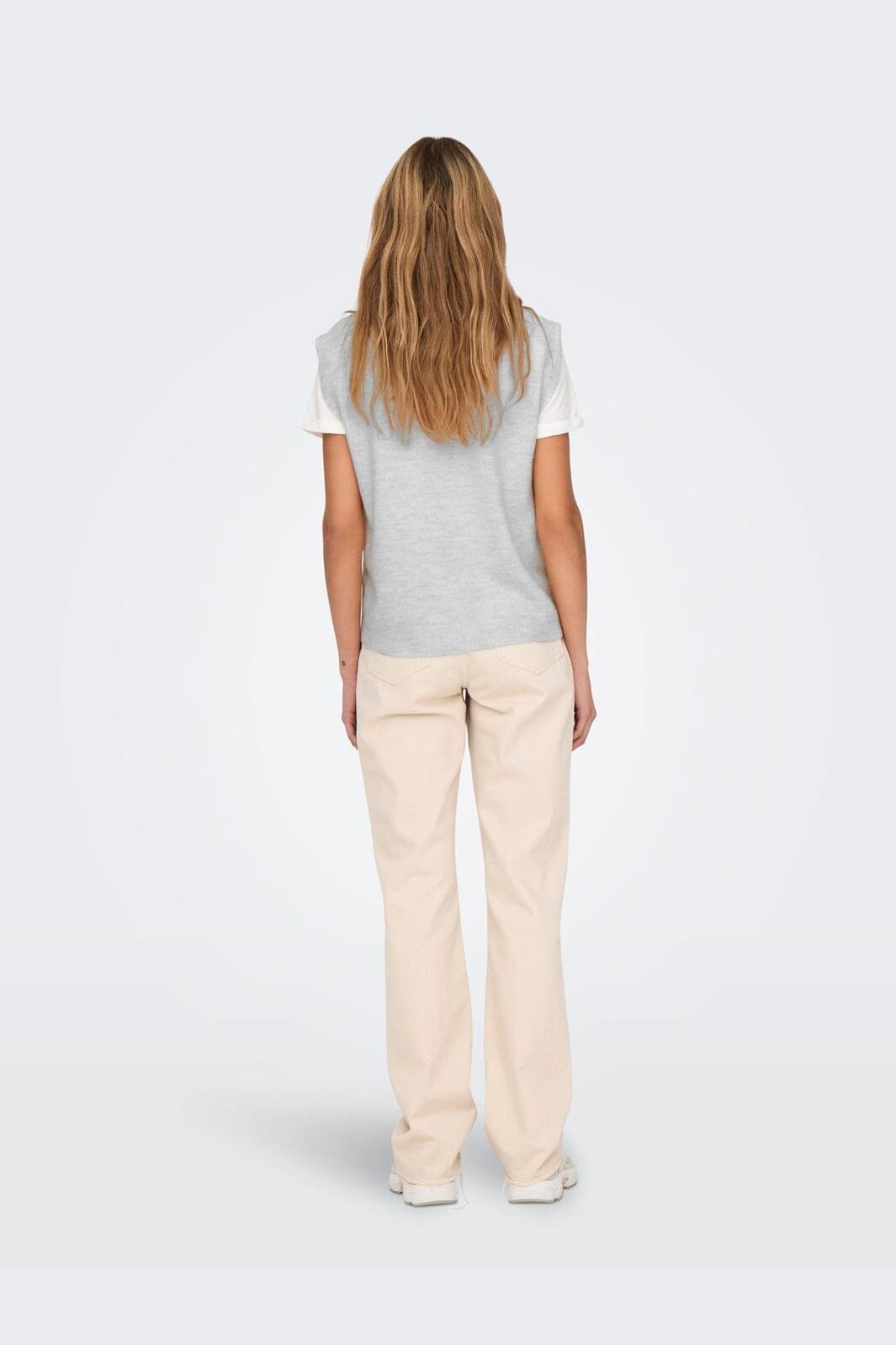 Un gilet tricoté de la marque Only dans une nuance gris clair avec des cœurs dorés brodés. Le gilet présente un col rond et une coupe sans manches avec bords-côtes.