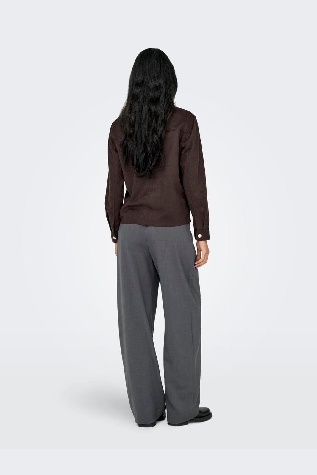 Chemise brune de Only, fabriquée en faux daim. La chemise a un col classique et des manches longues avec fermeture à boutons aux poignets.