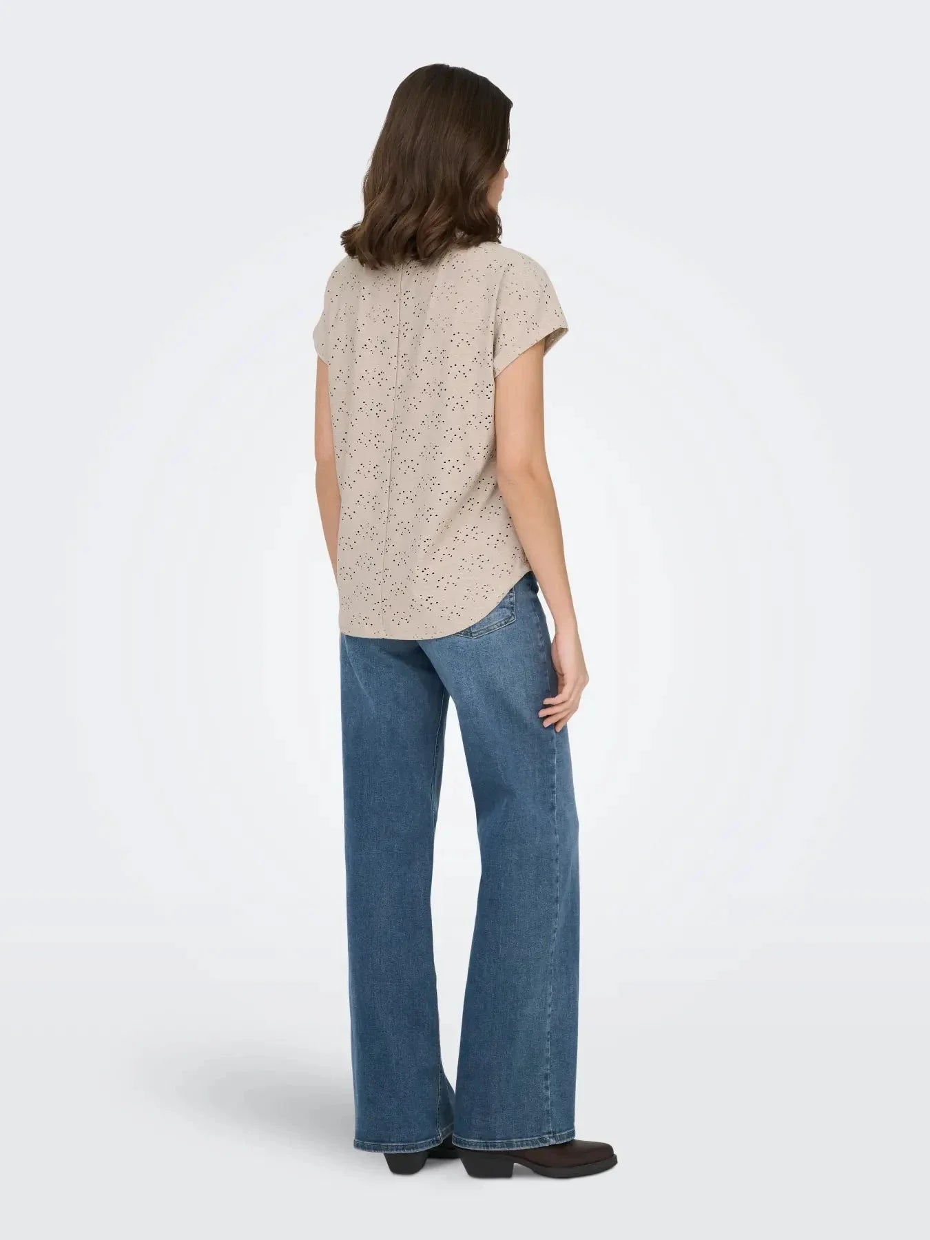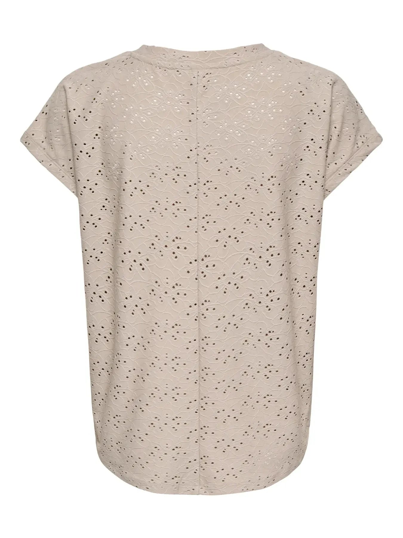 Top gris de la marque Only avec détails en dentelle et broderie. Le top est réalisé dans une teinte unie beige-gris et possède des manches courtes avec revers.