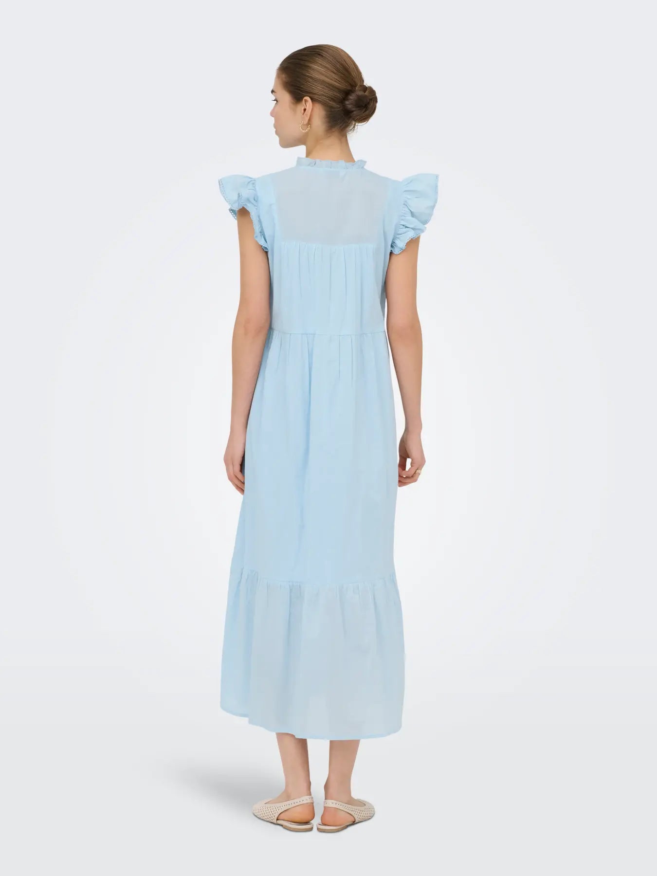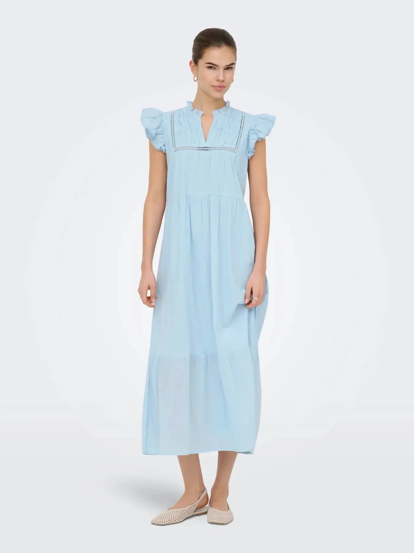 Robe bleu clair de la marque Only, confectionnée en 100 % coton. La robe présente des volants, des rubans et des détails en dentelle qui lui confèrent une allure féminine.