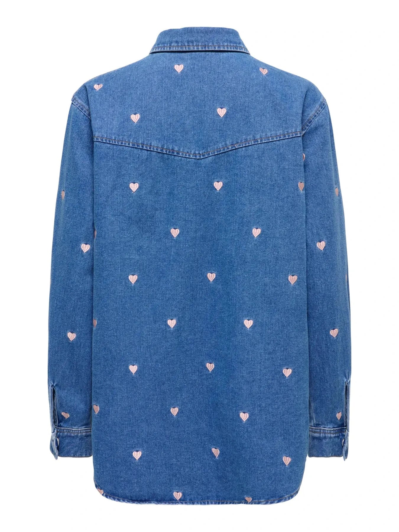 Une chemise en denim de la marque Only, de couleur bleu moyen, avec de petits cœurs brodés répartis sur tout le tissu. La chemise possède des manches longues et un col de chemise classique.
