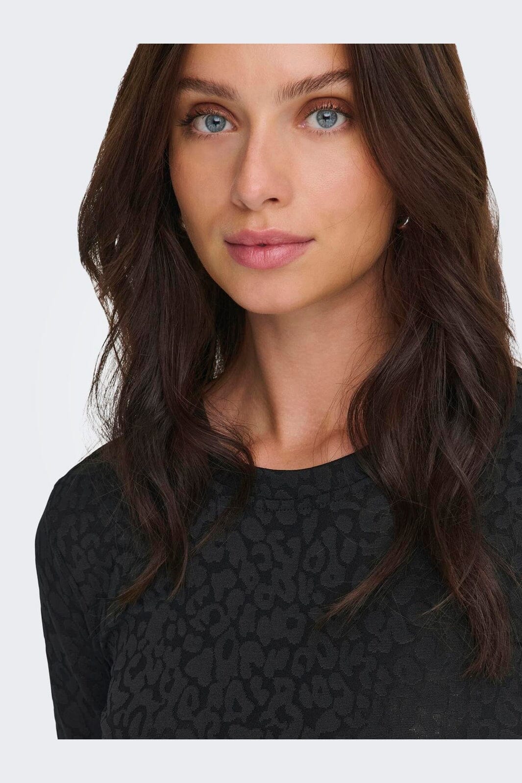 Top noir à manches longues de Only avec col rond et motif léopard. Le top a une coupe près du corps et est fabriqué dans une qualité douce avec élasticité, ce qui le rend agréable à porter.