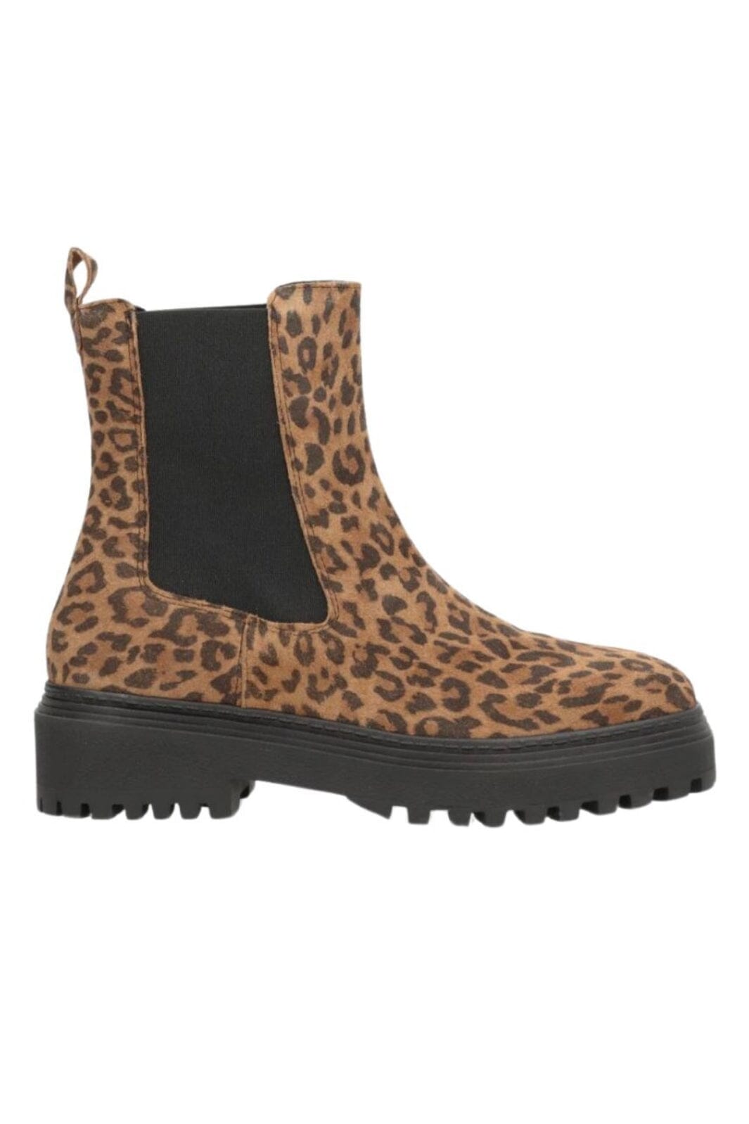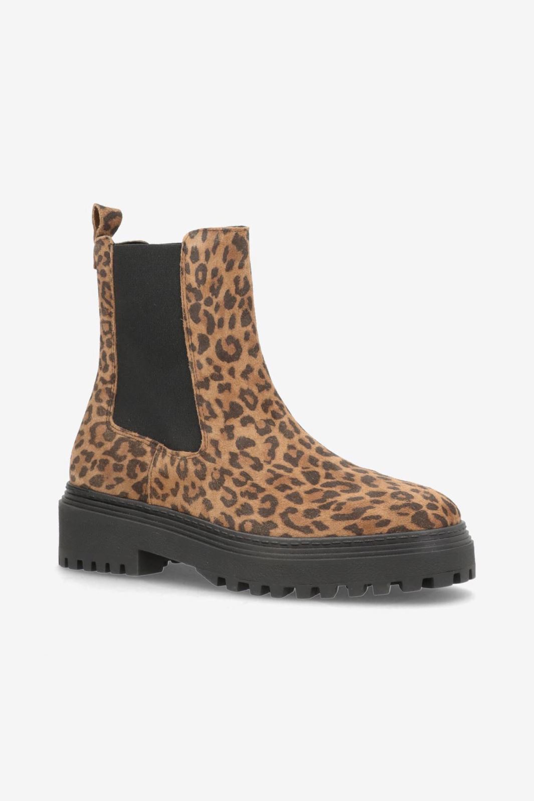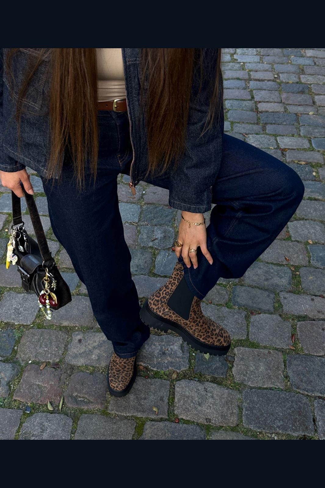 Bottine en daim avec motif léopard et semelle épaisse. La bottine a un talon bloc et une fermeture élastique au niveau de la cheville. La pointe en amande offre suffisamment d'espace pour les pieds.