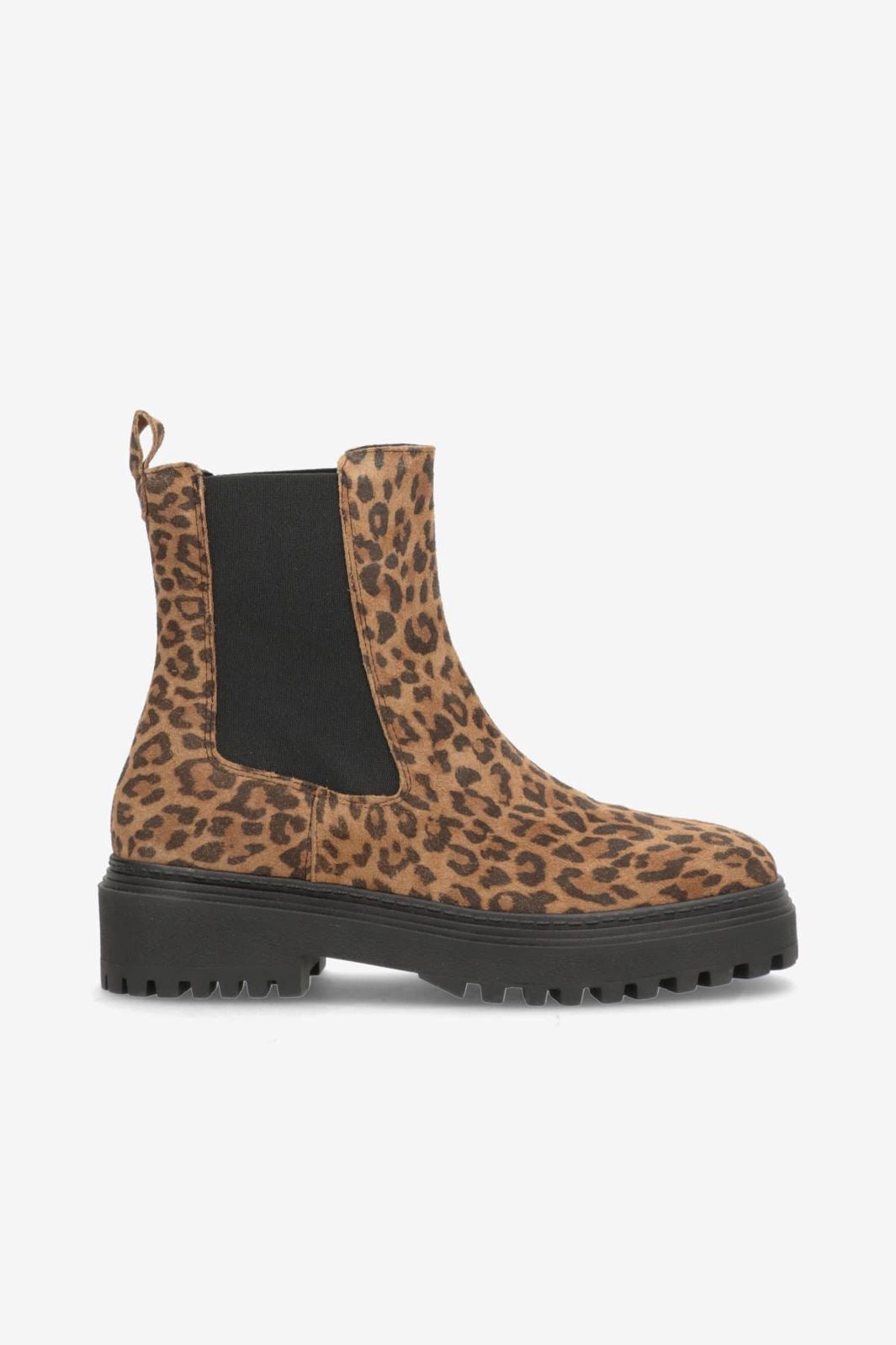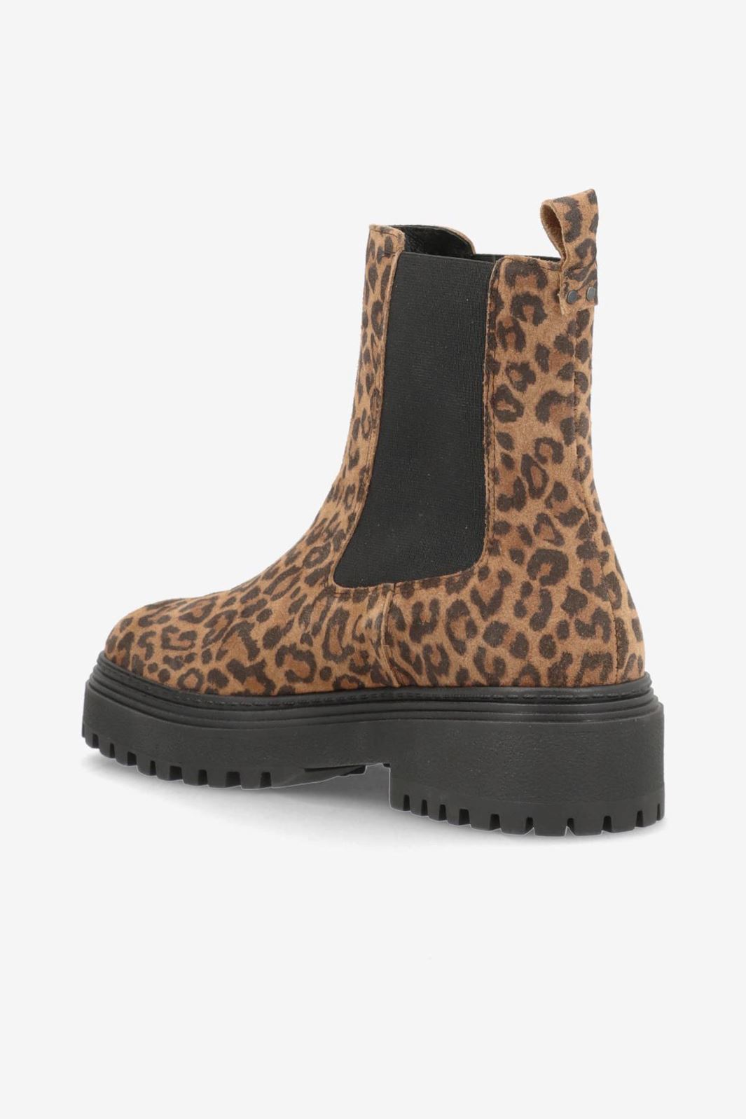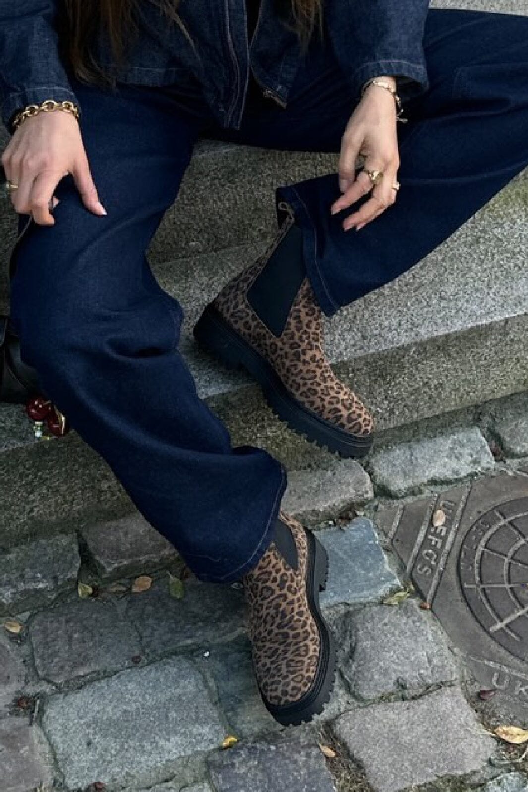 Bottine en daim avec motif léopard et semelle épaisse. La bottine a un talon bloc et une fermeture élastique au niveau de la cheville. La pointe en amande offre suffisamment d'espace pour les pieds.