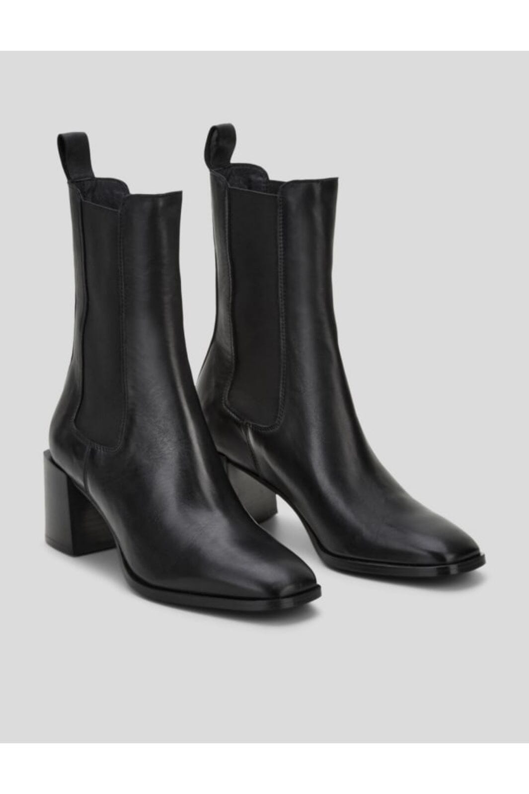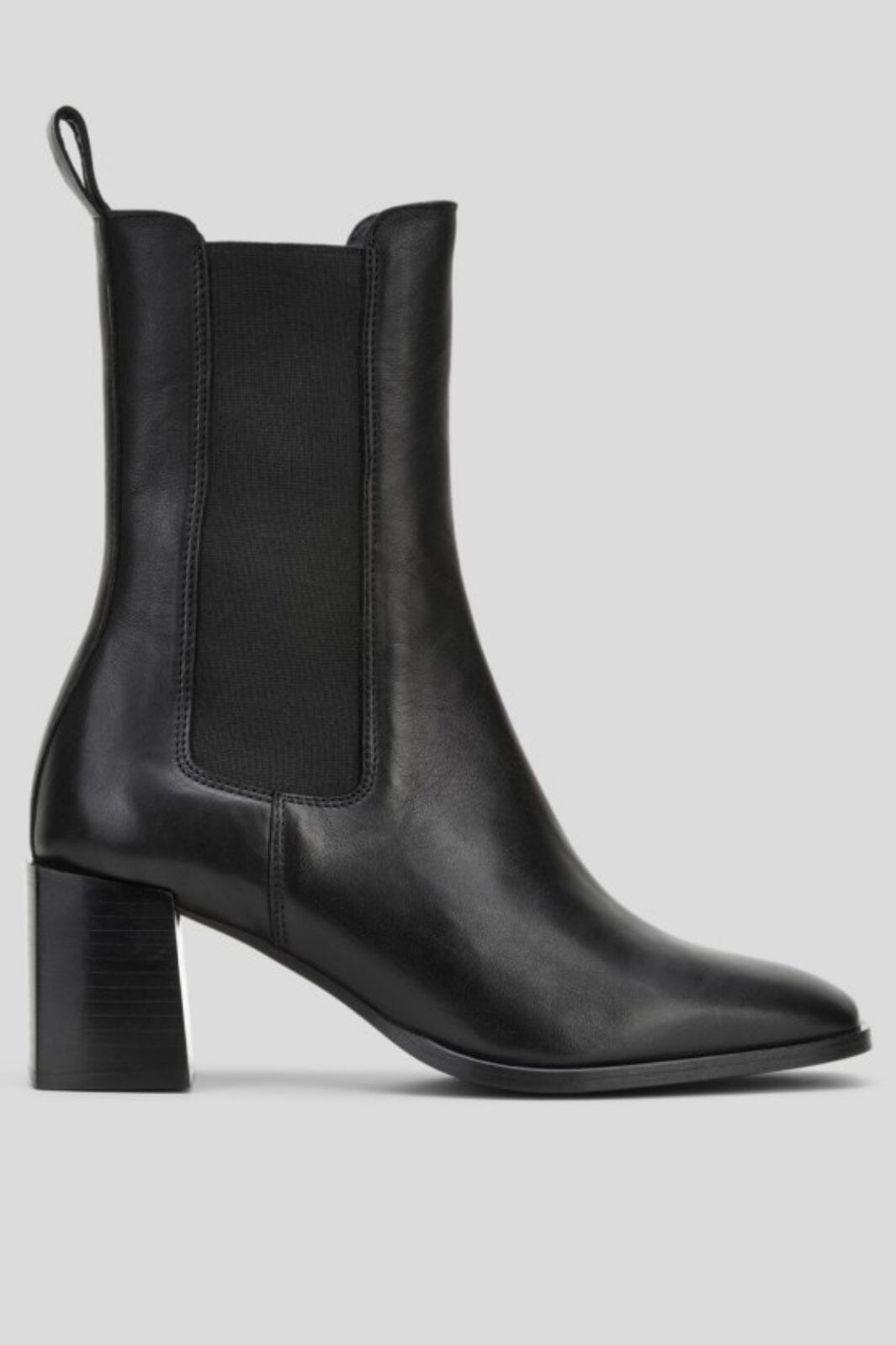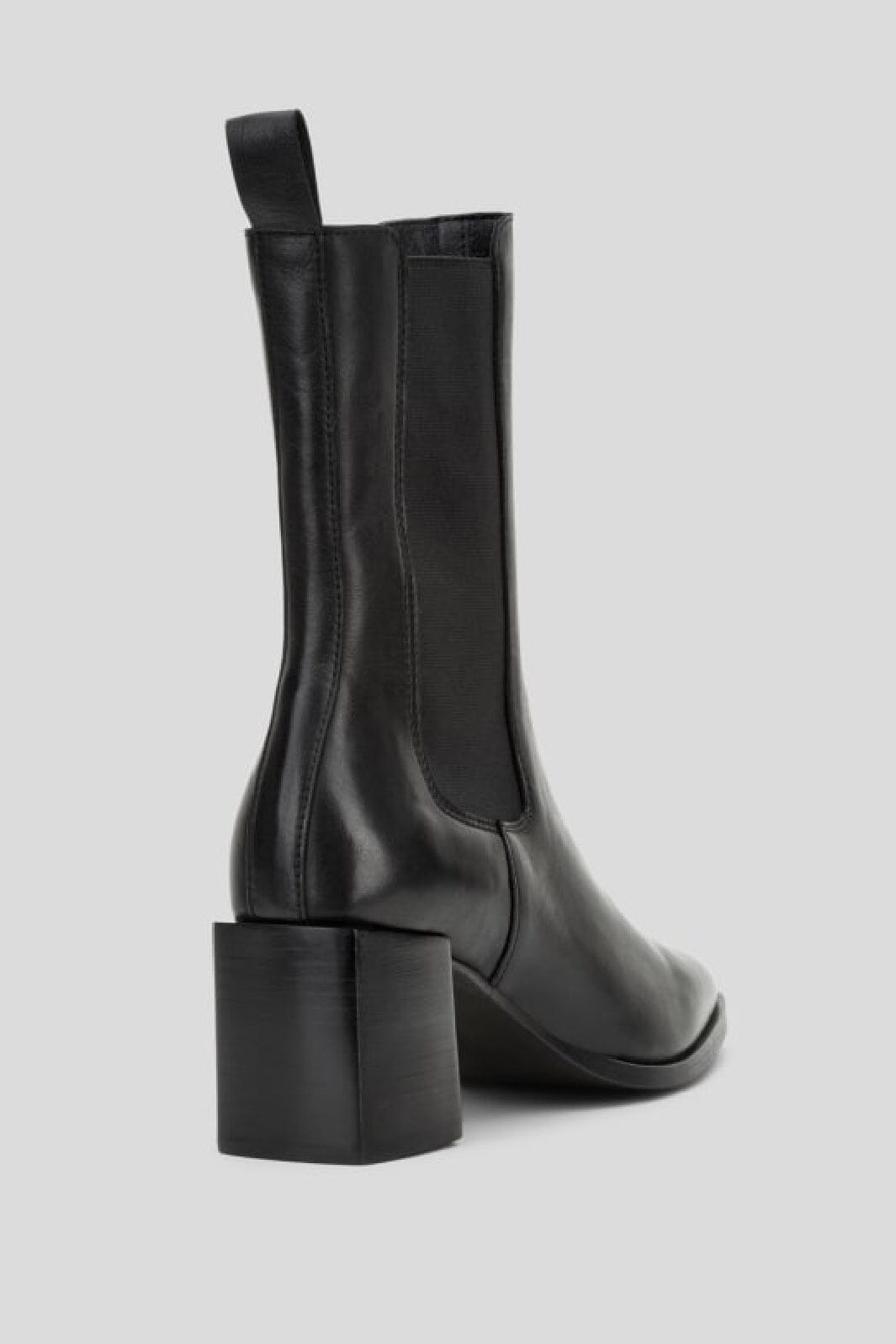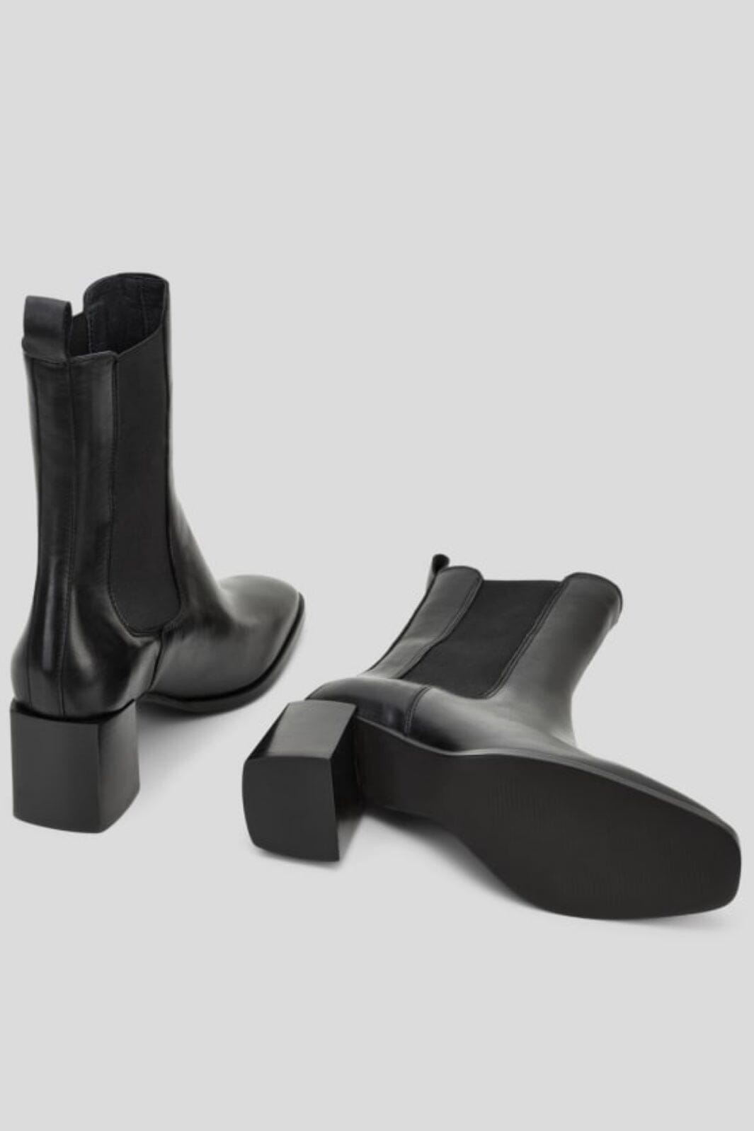 Bottines noires de Phenumb Copenhagen en cuir avec talon bloc. La botte a des panneaux latéraux élastiques et un bout carré.