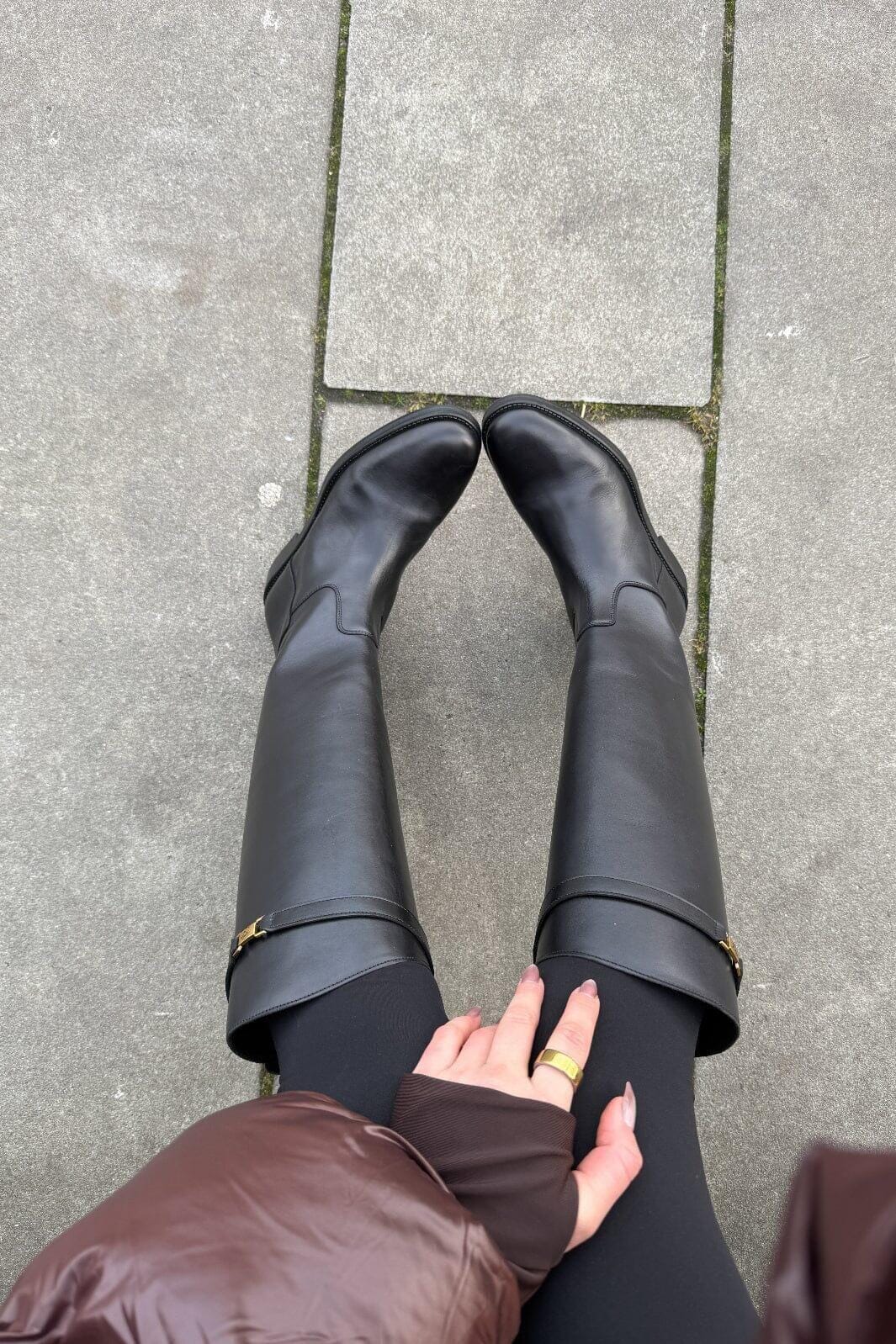 Botte haute de Phenumb Copenhagen, en cuir noir. La botte possède une tige haute qui monte jusqu’au genou et une boucle décorative près du haut.