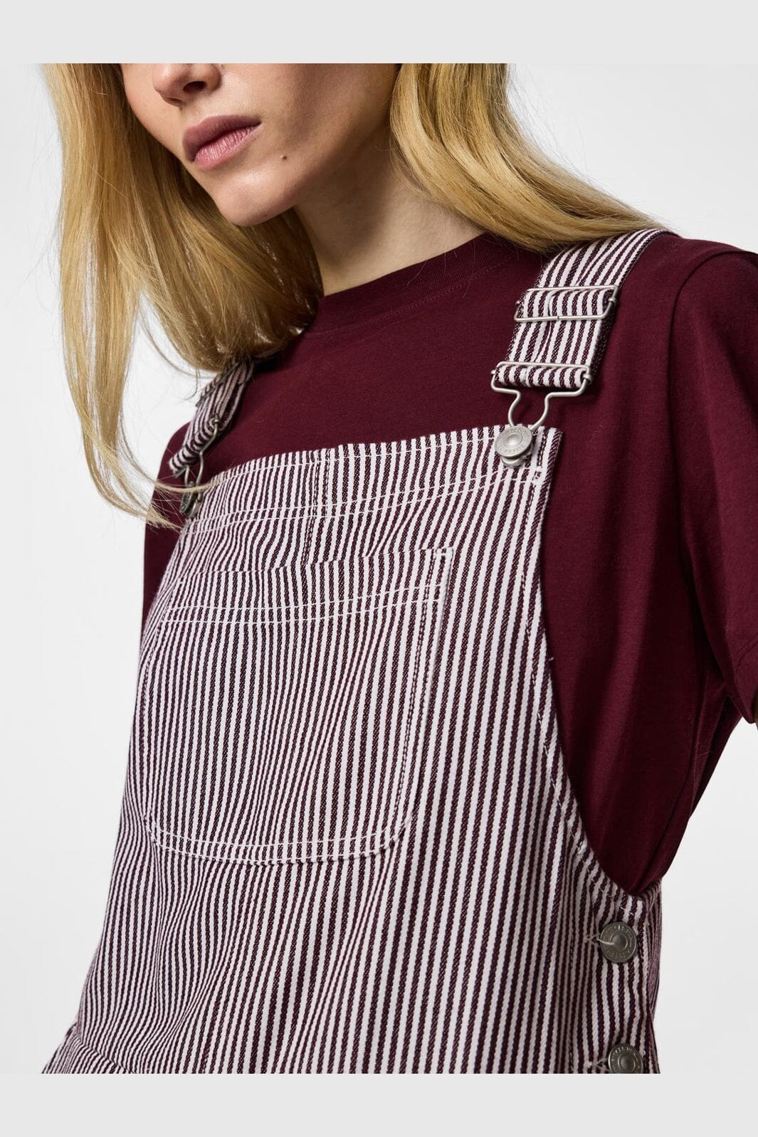 Salopette rayée Pieces en bordeaux, rouge et blanc. Fabriquée en 55 % coton et 45 % polyester avec une coupe ample et une longueur jusqu’au sol.