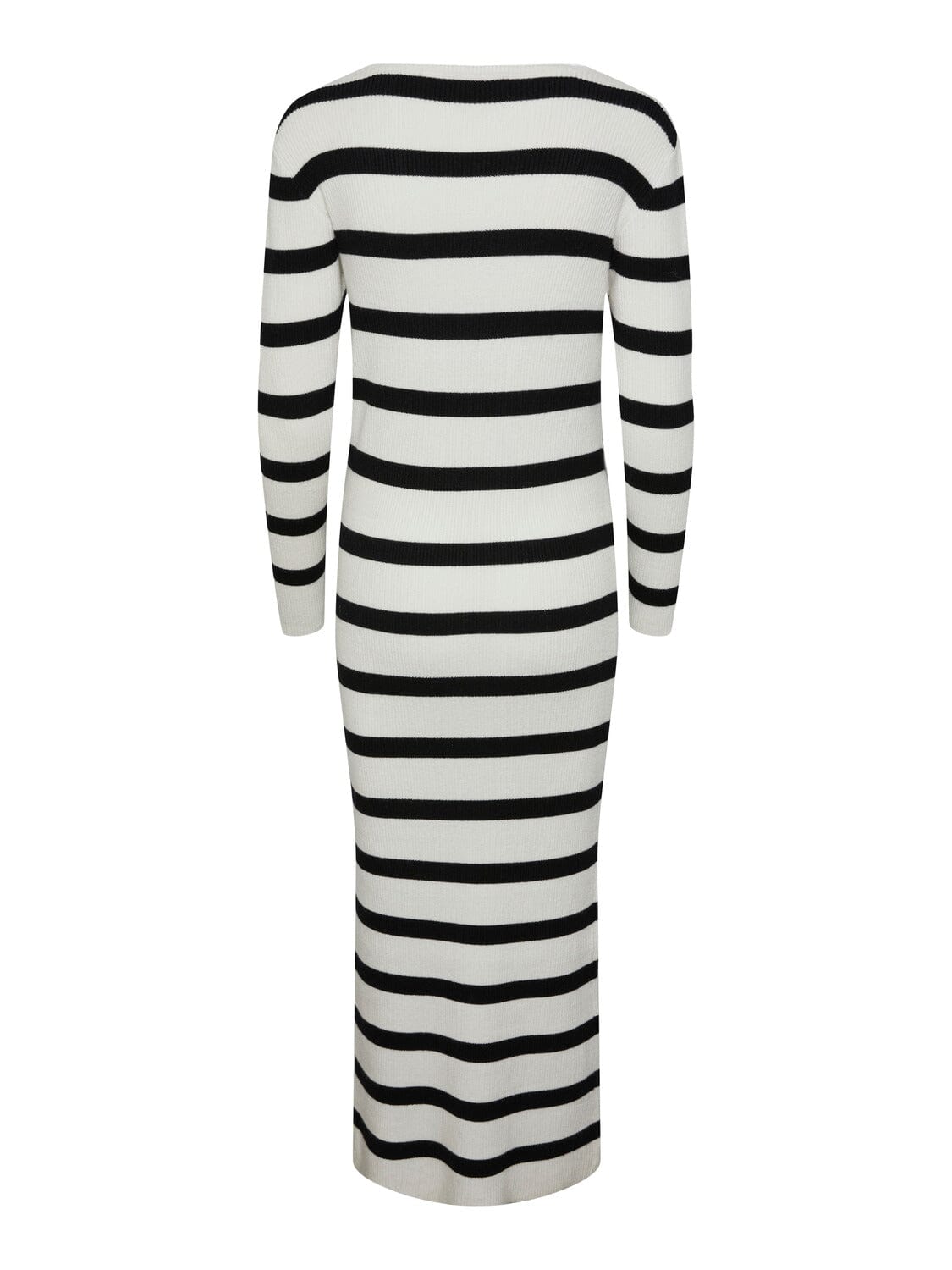 Robe en tricot rayée de Pieces en noir et blanc. La robe a une longueur cheville avec fente et est fabriquée dans un mélange de tricot doux avec un décolleté en V et des manches longues.