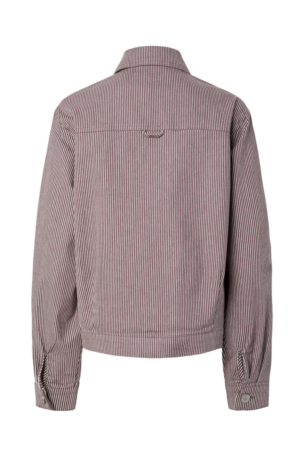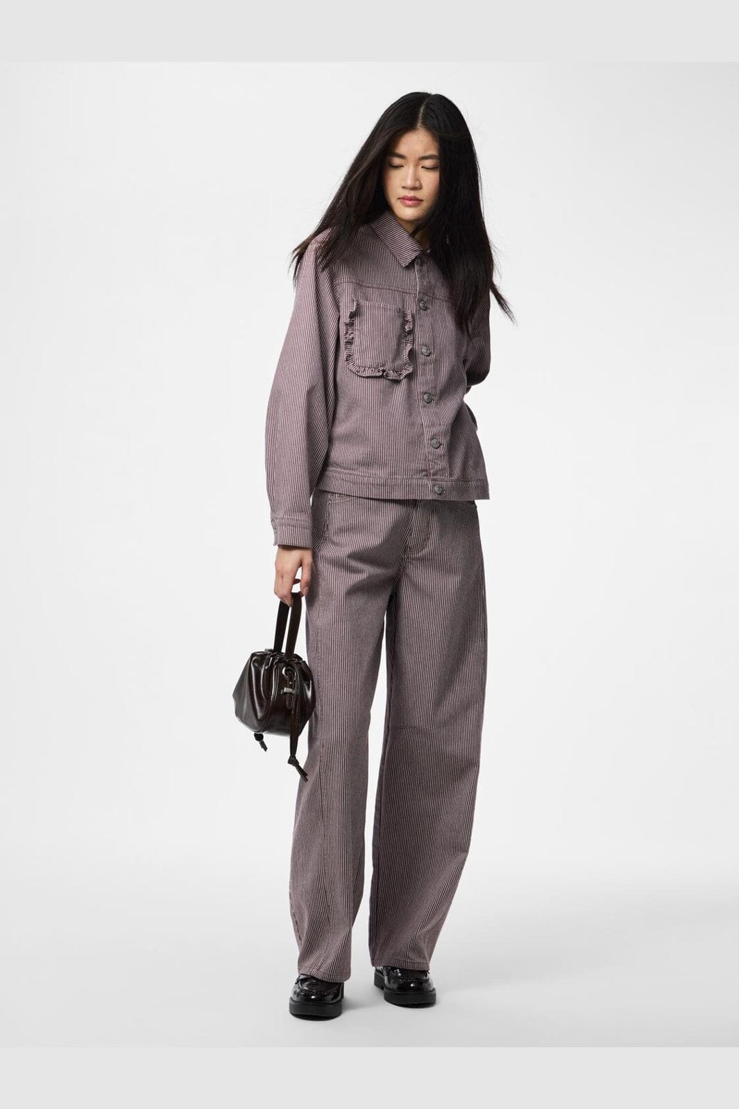 Veste en denim rayée de Pieces dans des nuances brun-gris avec des rayures blanches. La veste présente une coupe ample et des volants décoratifs sur les poches.