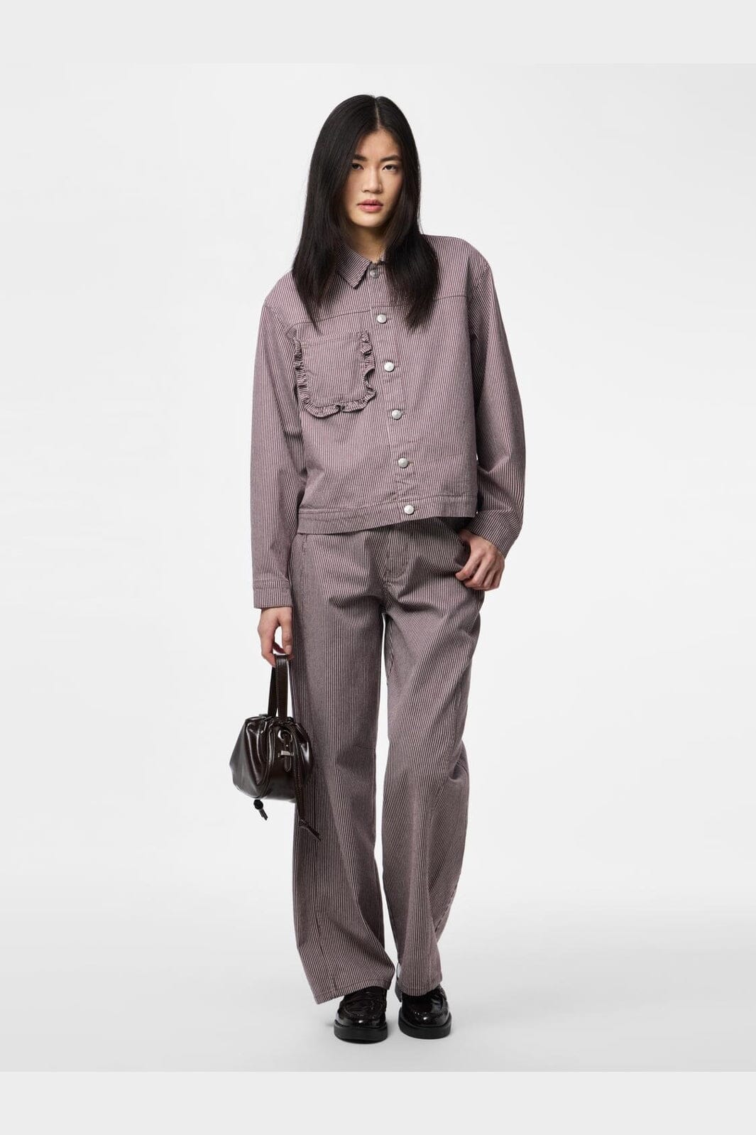 Jean Pieces à motif rayé blanc, brun, gris et crème. Le jean présente une coupe ample et une longueur cheville.