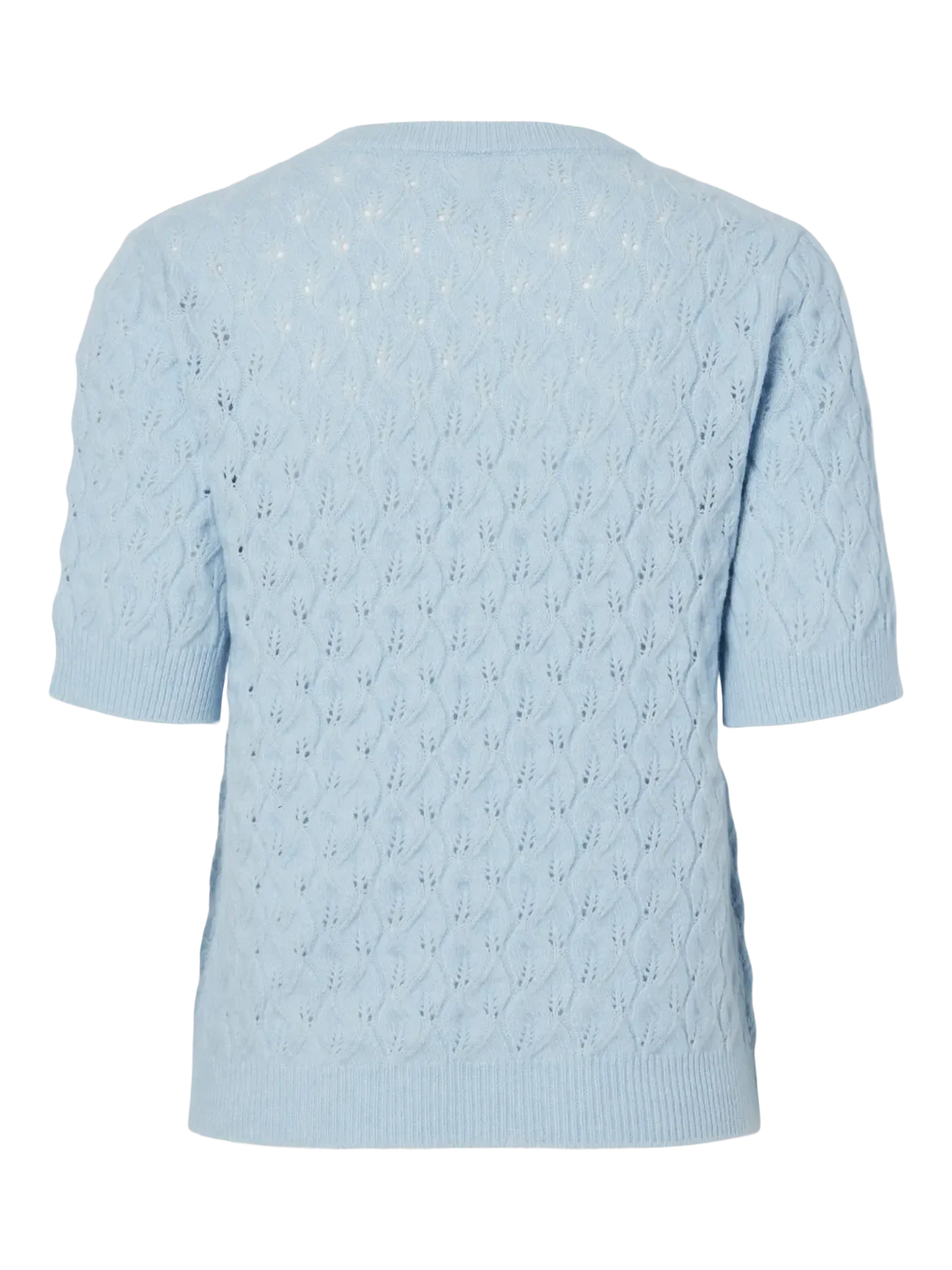 Un pull en maille de la marque Pieces dans une couleur bleu clair chiné. Le pull a des manches courtes, un col rond et des coutures décoratives formant un motif de feuilles.