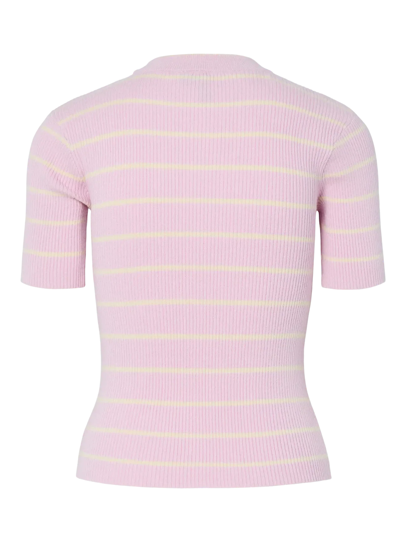 Top en maille de Pieces, de couleur lilas clair avec des rayures roses. Le top possède des manches courtes, une encolure ronde et une coupe près du corps.