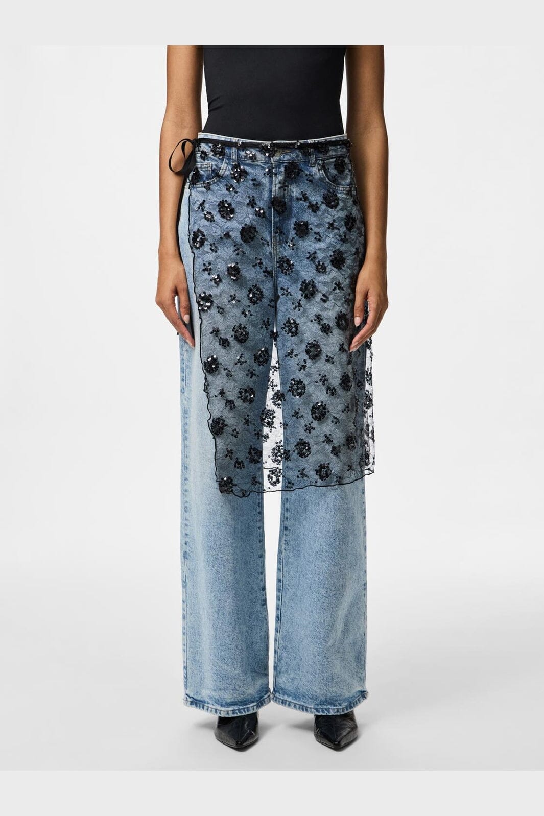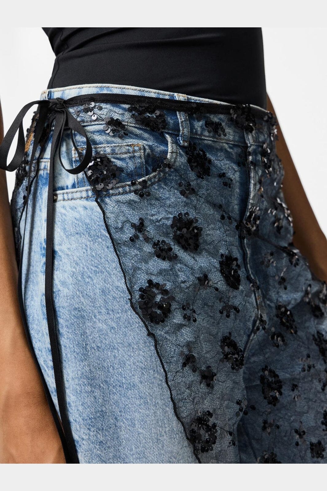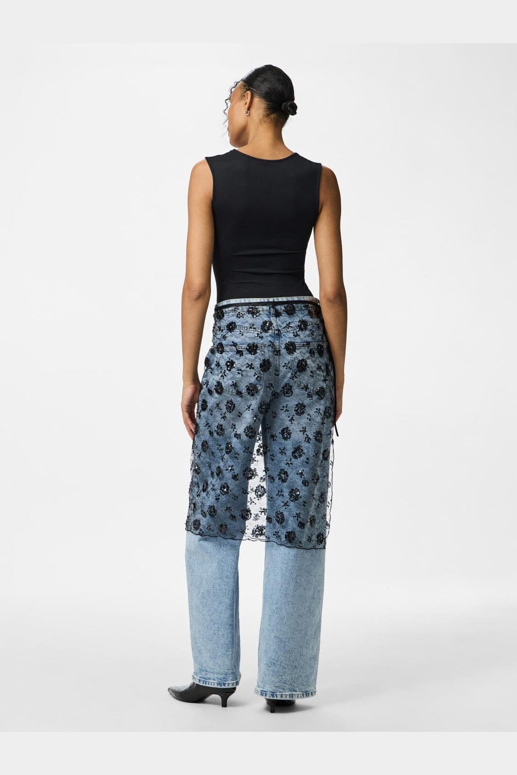 Sarong noir de Pieces, fabriqué en dentelle transparente avec un motif floral. Le sarong a des paillettes noires et un cordon à la taille.