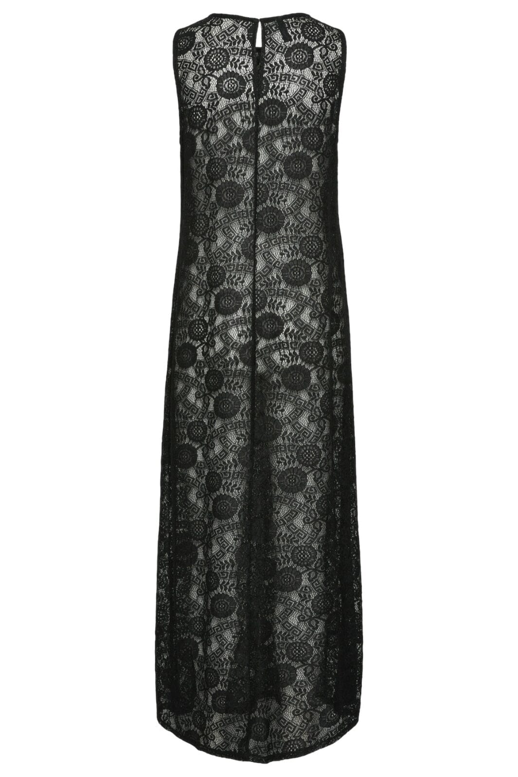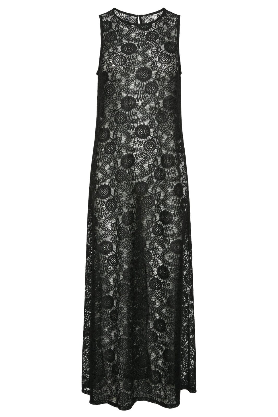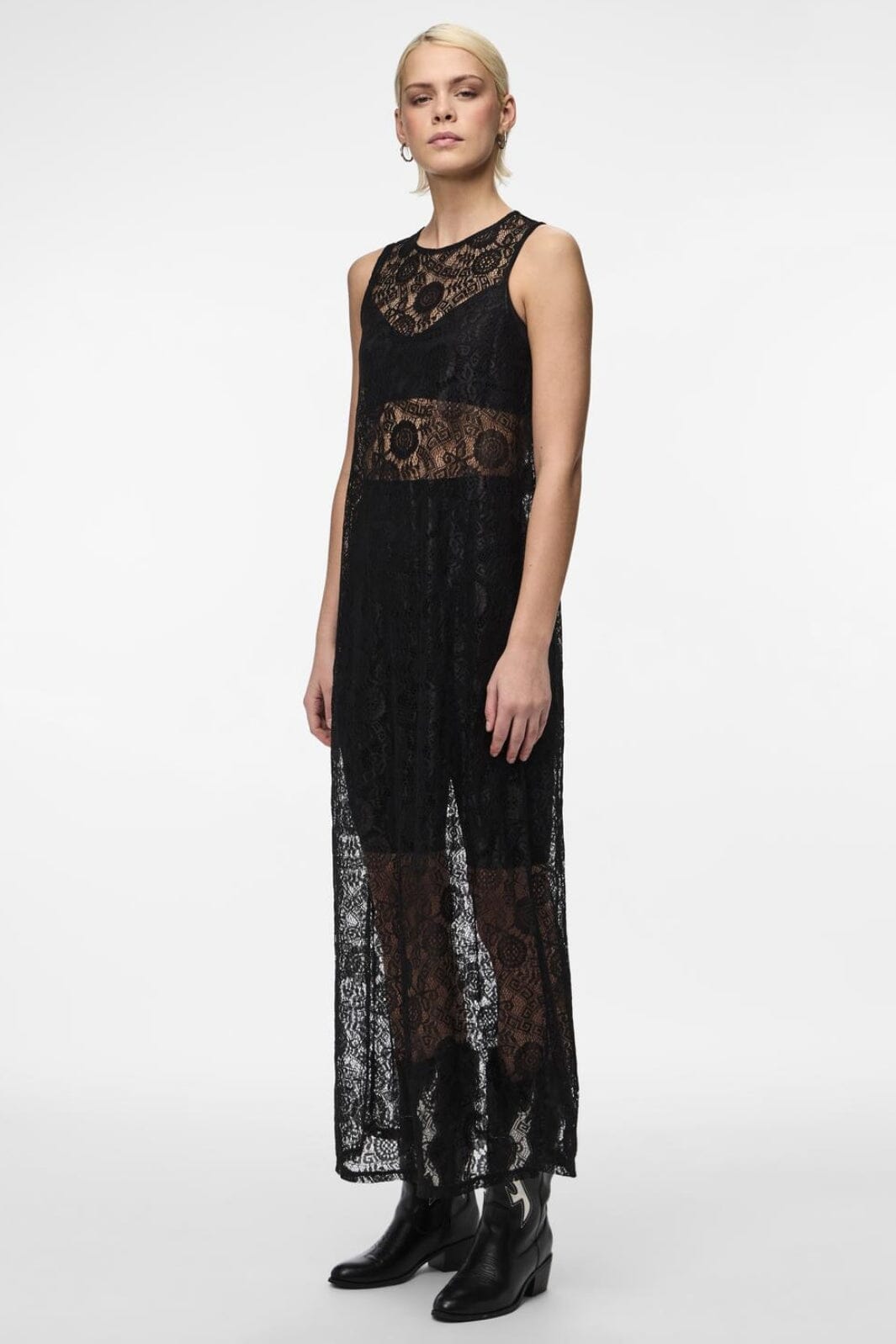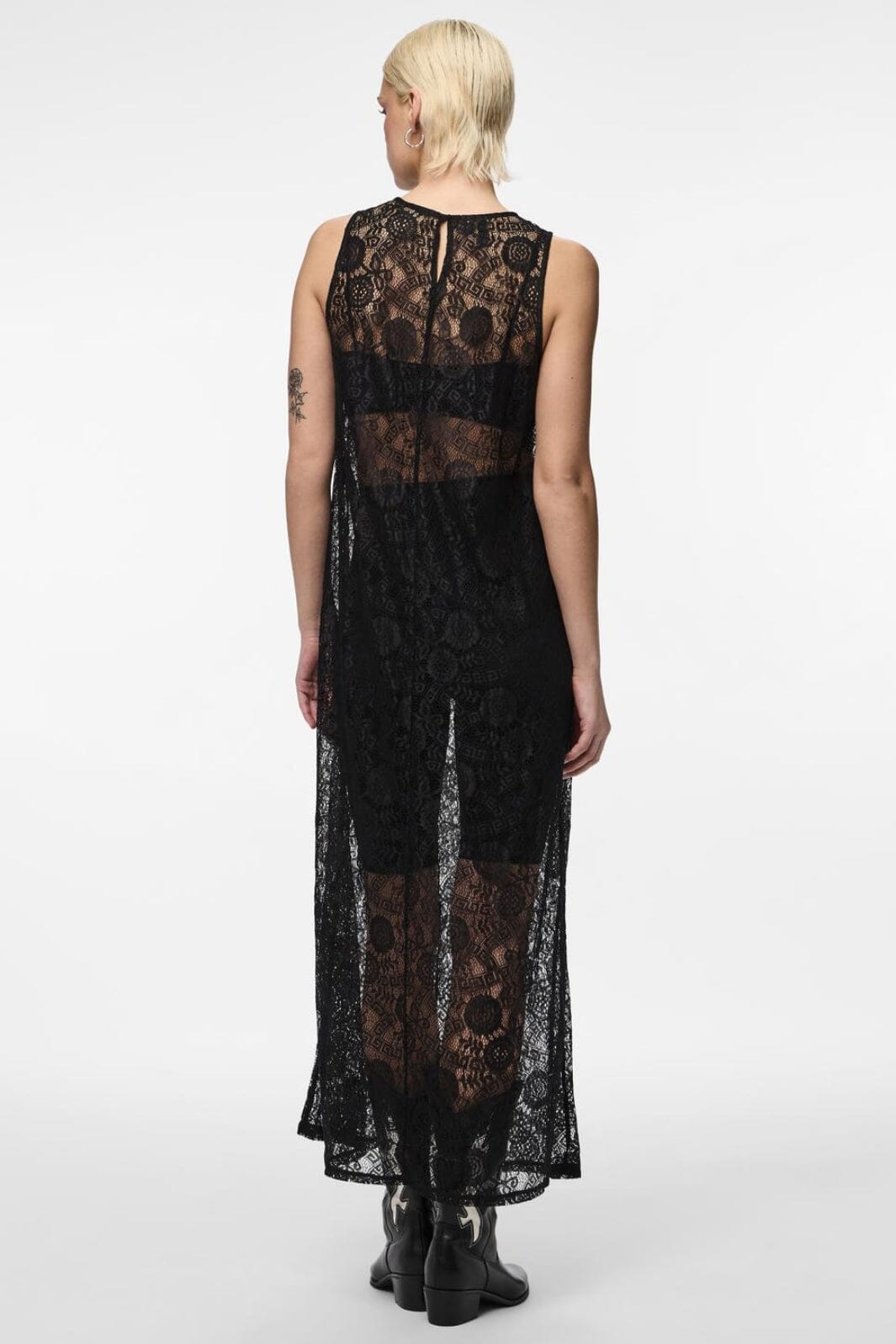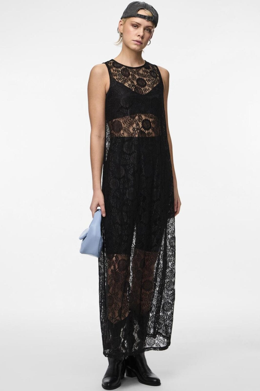 Robe en dentelle noire de Pieces avec motif floral. La robe a un col rond et arrive jusqu'aux chevilles. Le design sans manches et le matériau en dentelle donnent à la robe une allure légère.