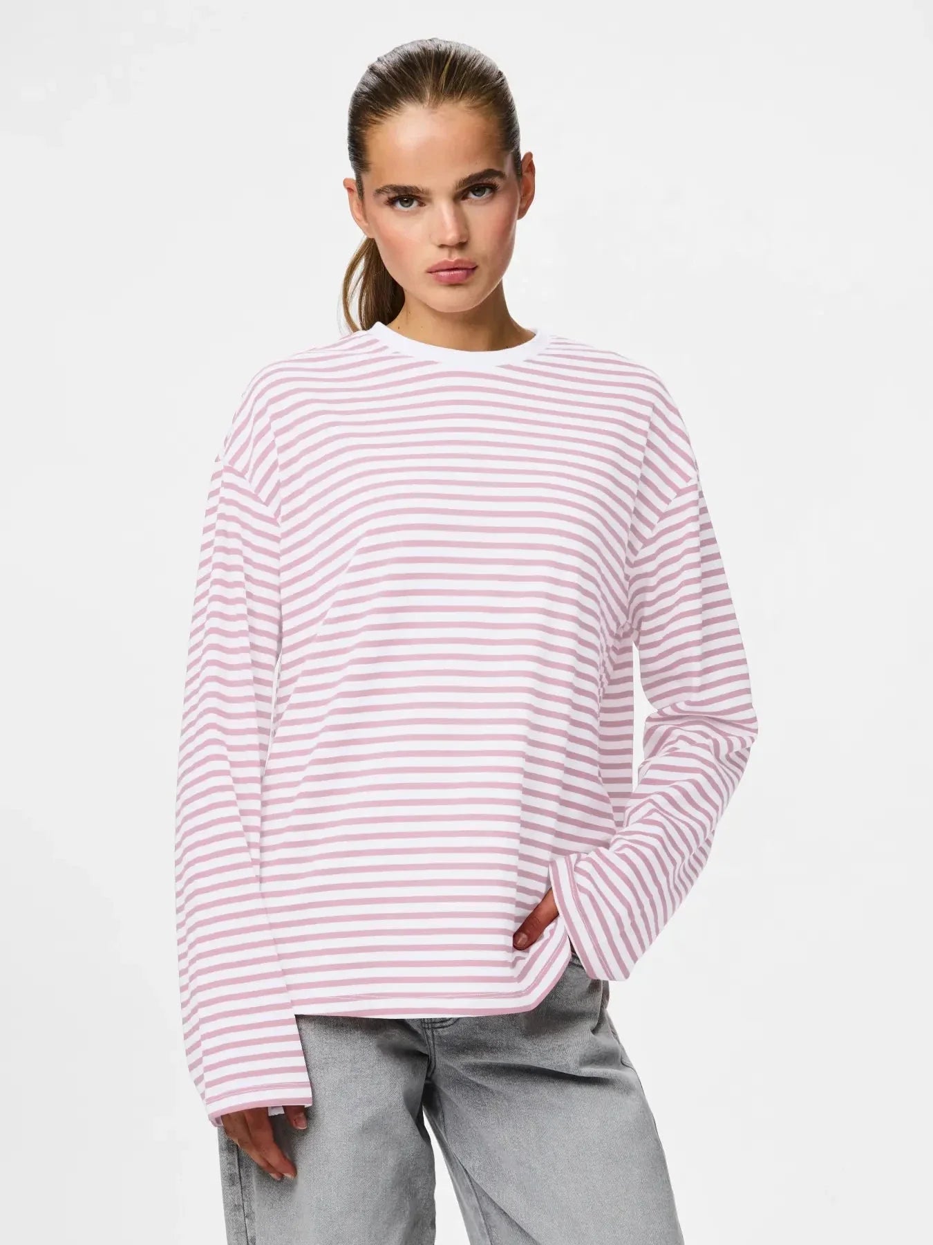 Haut à manches longues de Pieces avec des rayures blanches et rose clair. Composé de 75 % de coton et 25 % de polyester.