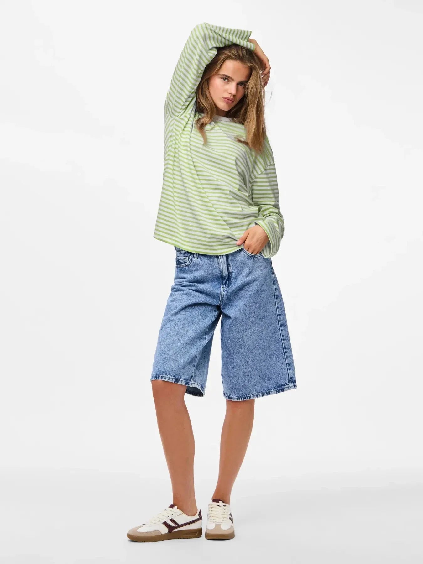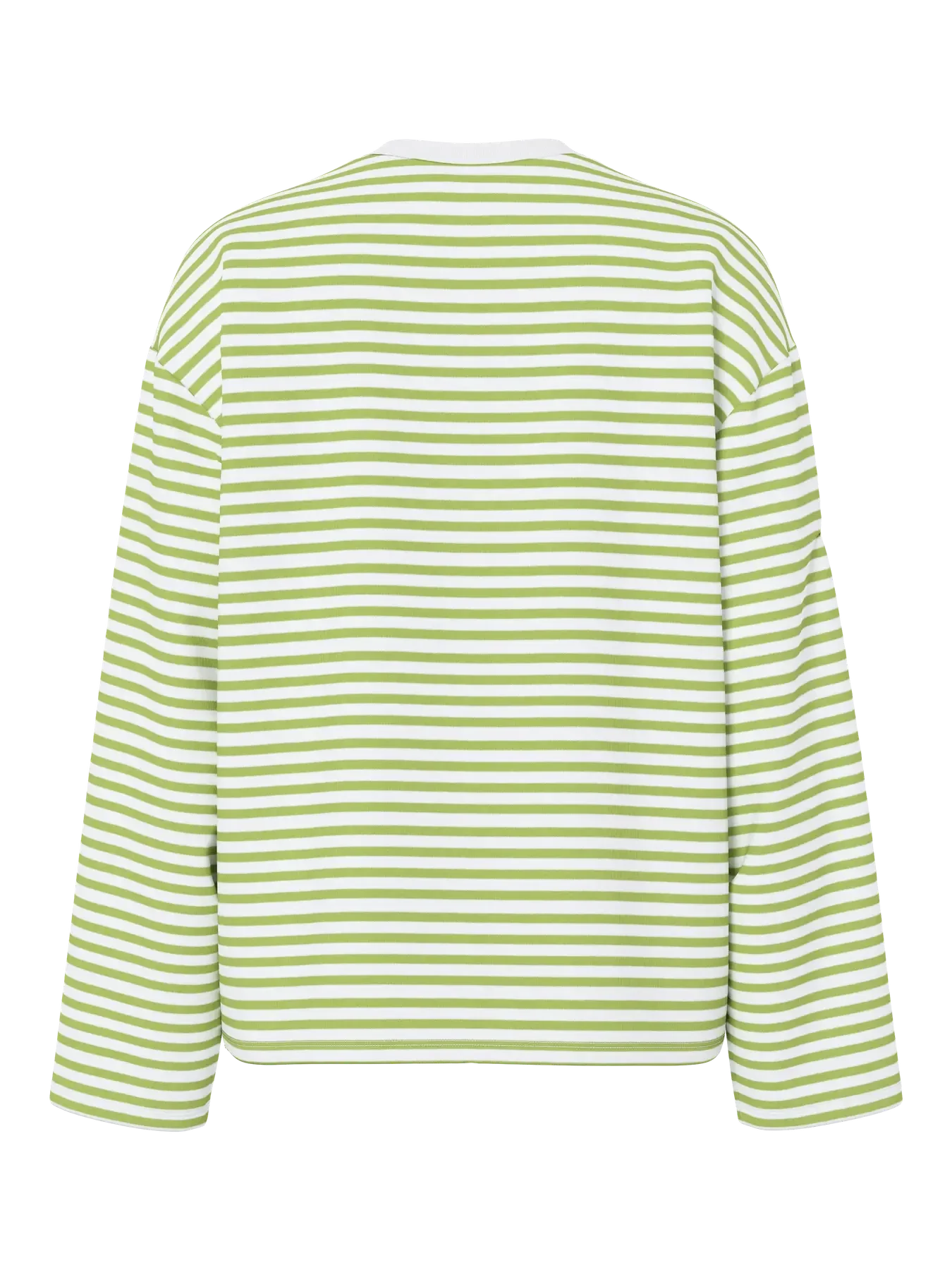 Haut à manches longues de Pieces avec des rayures vertes et blanches. Le haut possède un col rond avec bordure blanche et une coupe oversize.