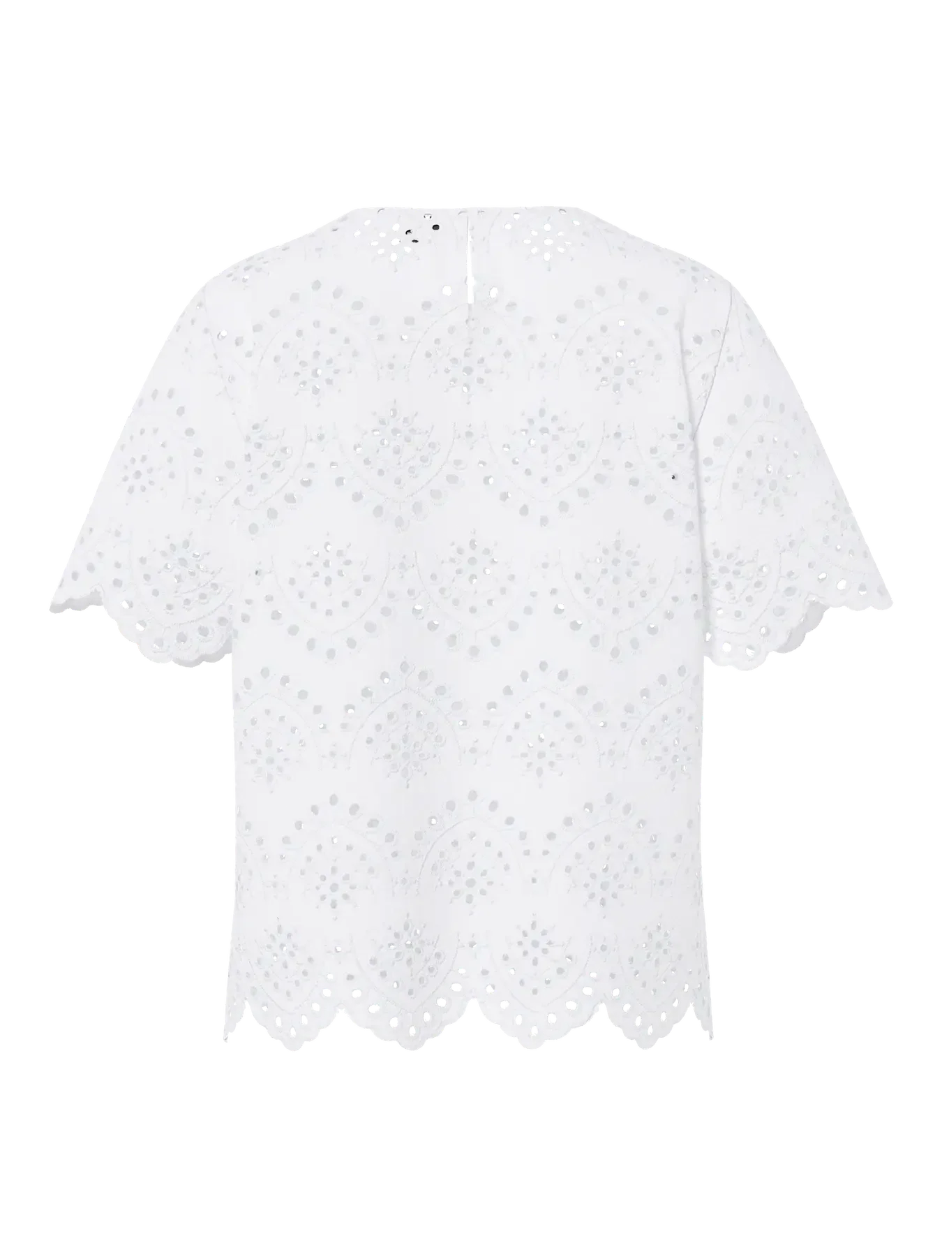 Haut blanc de Pieces, en coton avec broderie et coutures décoratives. Le haut possède des bords ondulés et une encolure ronde.