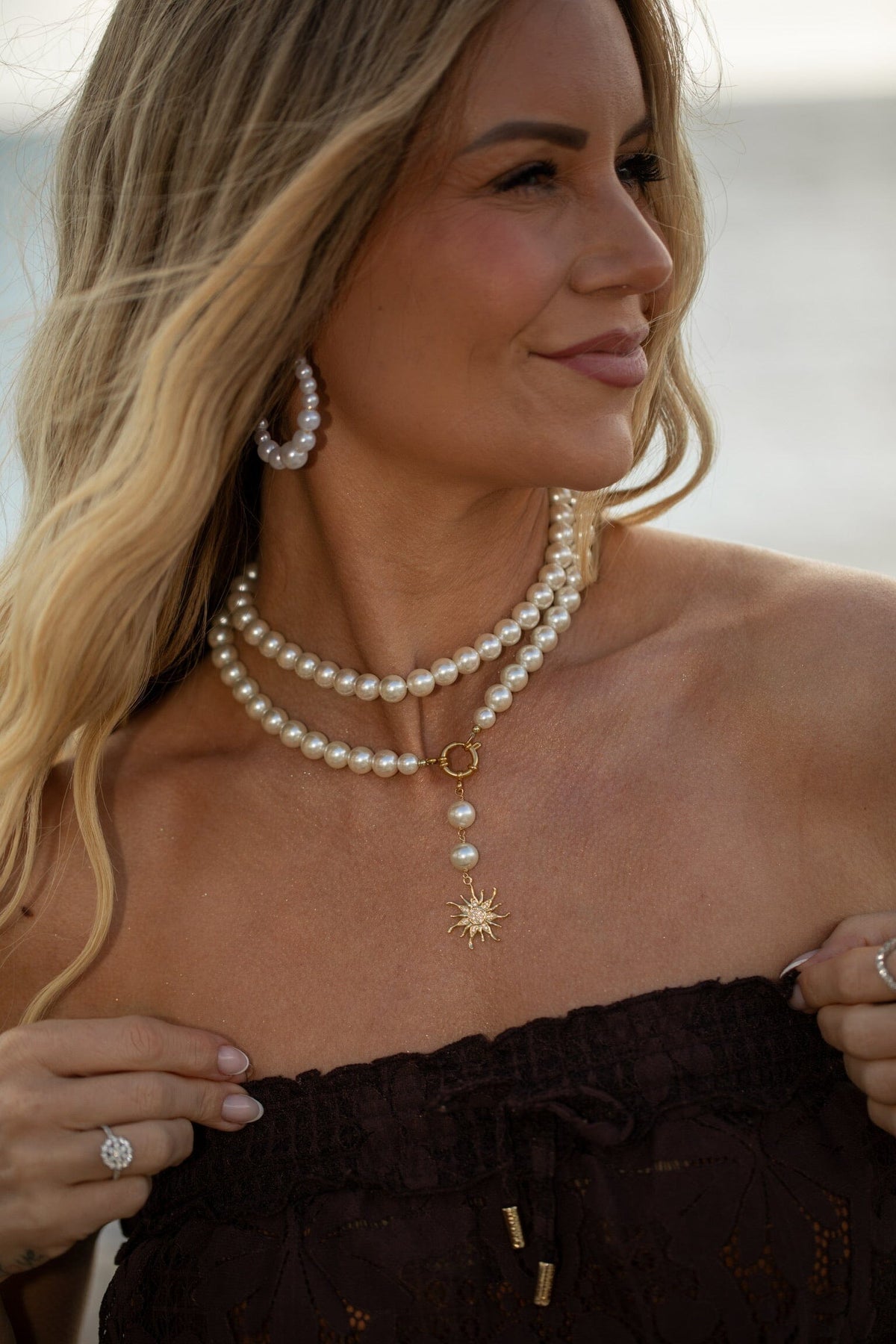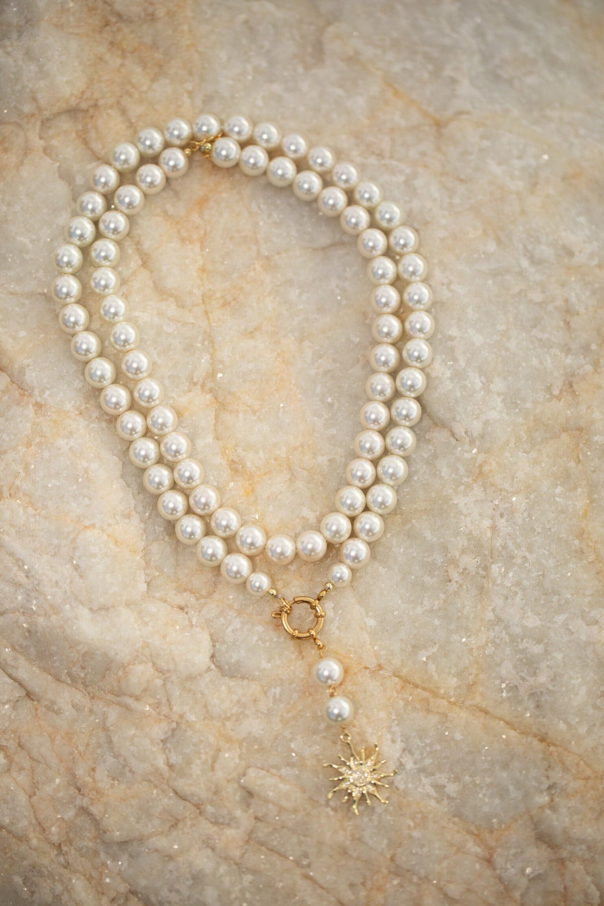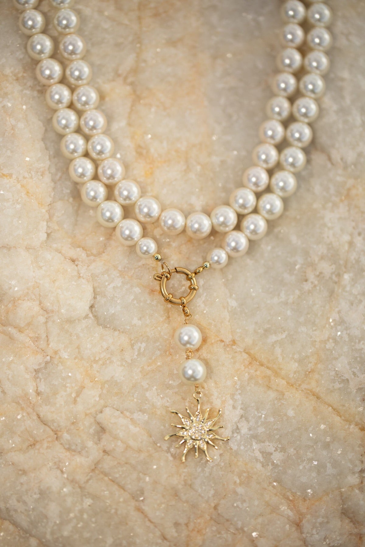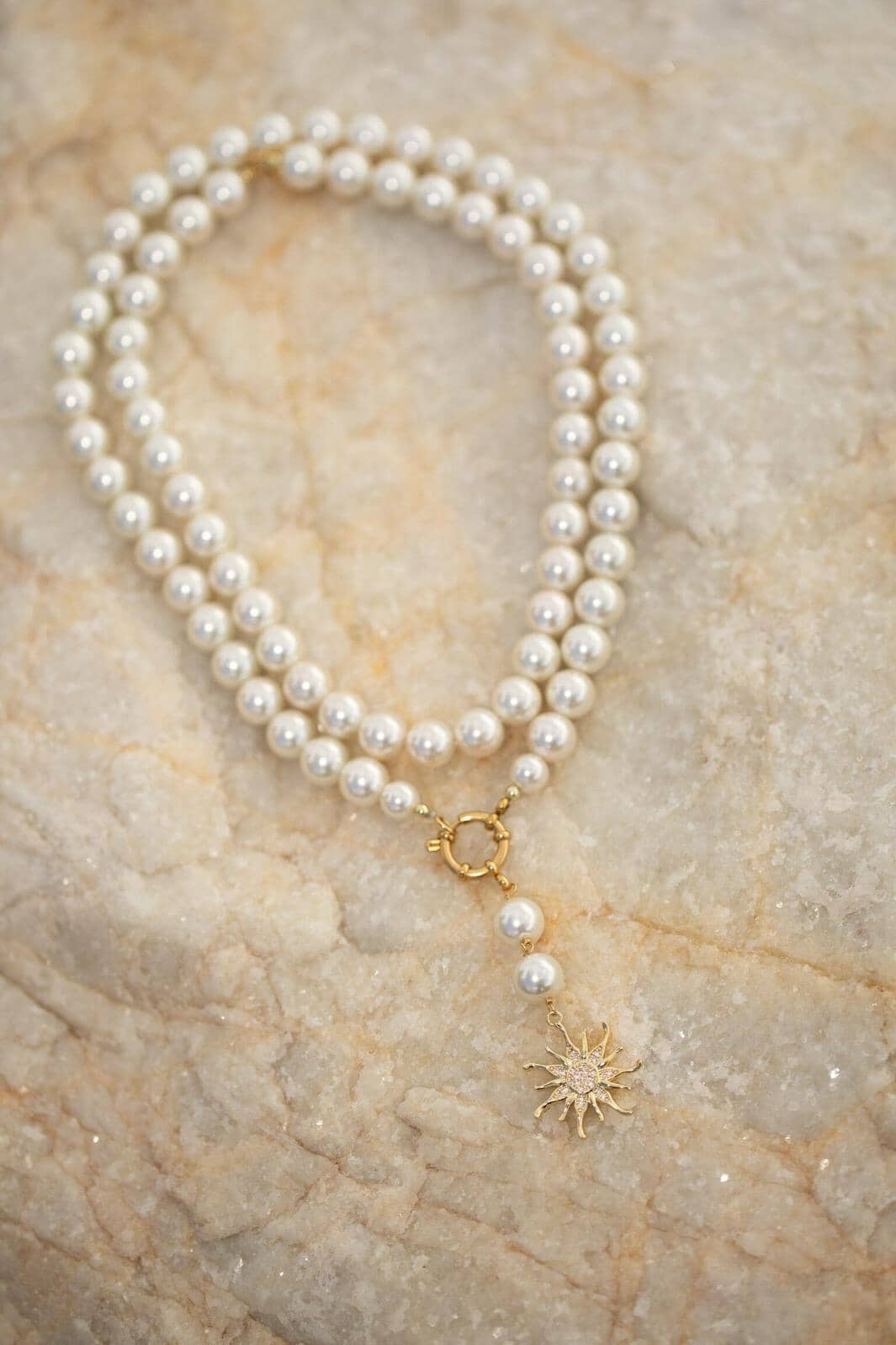 Collier ras-du-cou Rooted avec deux rangées de perles et de coquillages ainsi qu’un pendentif en forme de soleil. Le collier est doré à l’or fin et doté d’un fermoir doré.