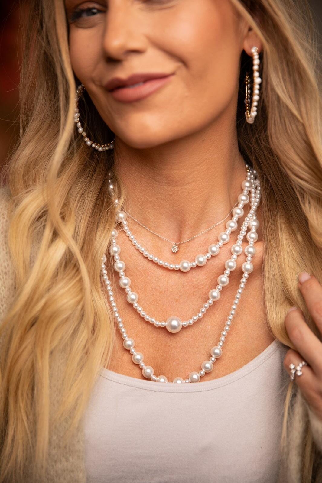 Un ensemble de 3 colliers de perles Rooted avec des perles blanches de différentes tailles et une finition dorée.