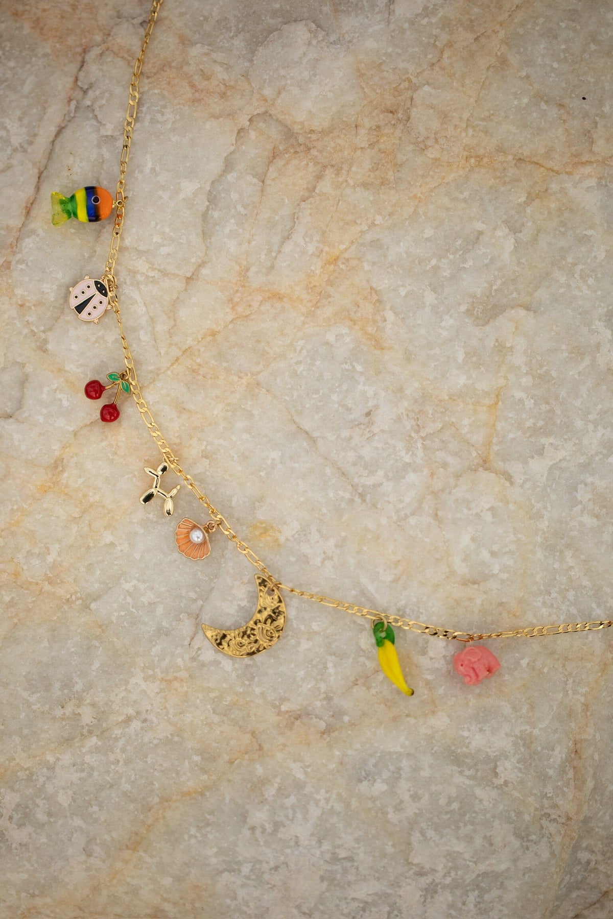 Collier de la marque Rooted, fabriqué en laiton doré. La chaîne a une couleur dorée et est ornée de plusieurs pendentifs colorés de formes variées.