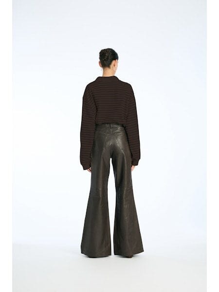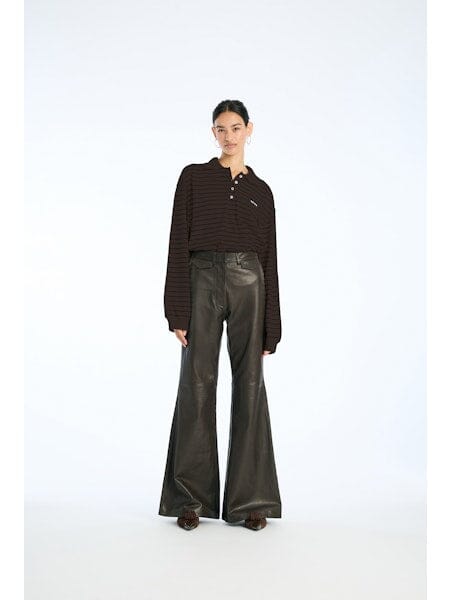 Polo manches longues en piqué de Rotate avec motif rayé dans des nuances de brun et de beige. Le polo présente une broderie sur la poitrine et une coupe oversize.