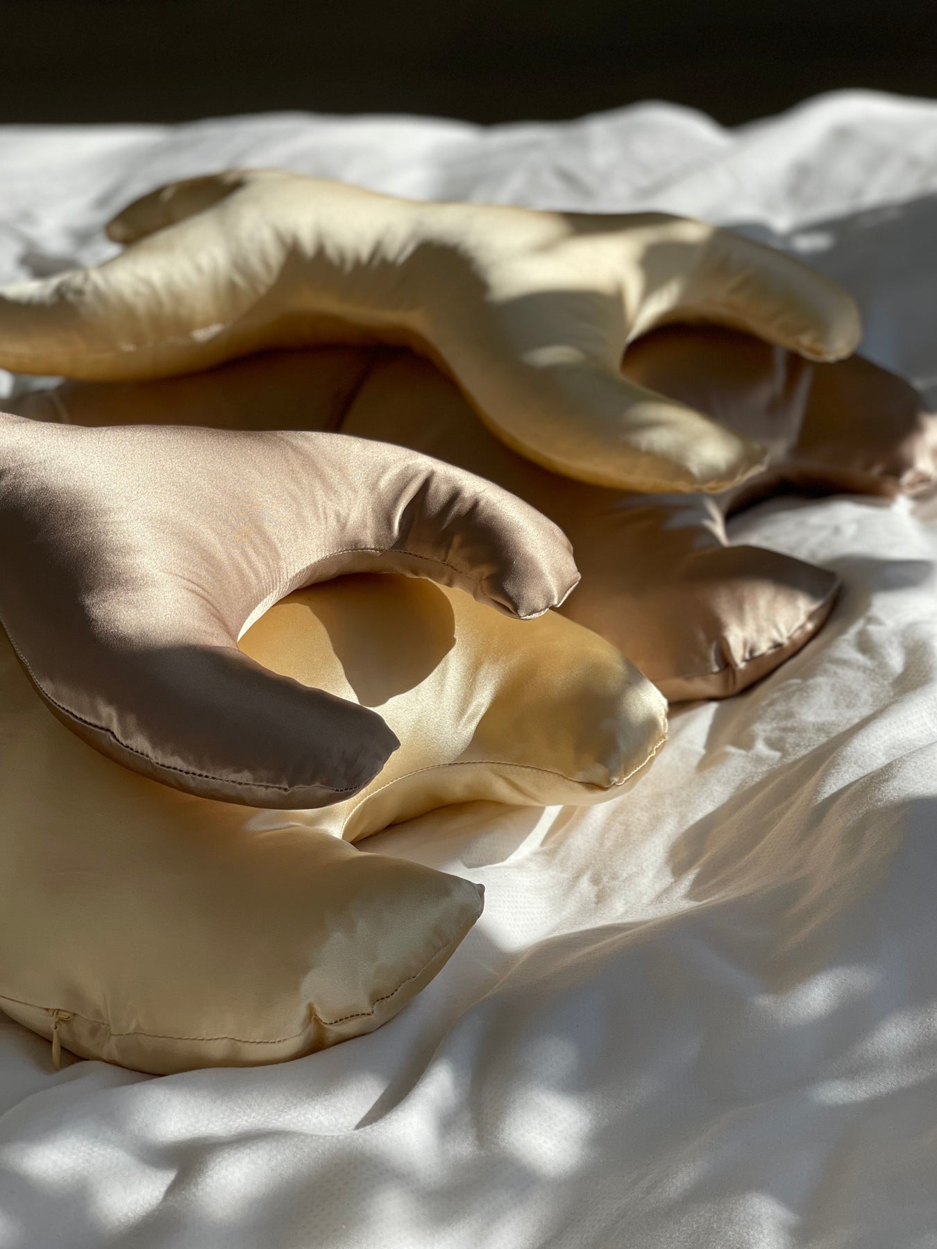 Housse de coussin de Save My Face en or clair. La housse est fabriquée en soie charmeuse avec une surface lisse et dispose d'une fermeture éclair YKK comme mécanisme de fermeture.
