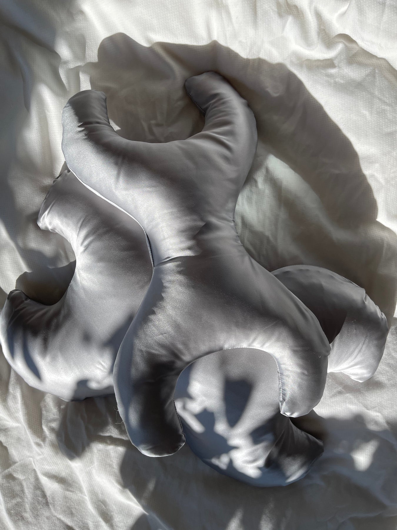 Housse en soie de Save My Face en argent pour l'oreiller Le Grand. La housse est fabriquée en soie charmeuse avec une surface lisse et brillante qui offre un bon confort toute la nuit.