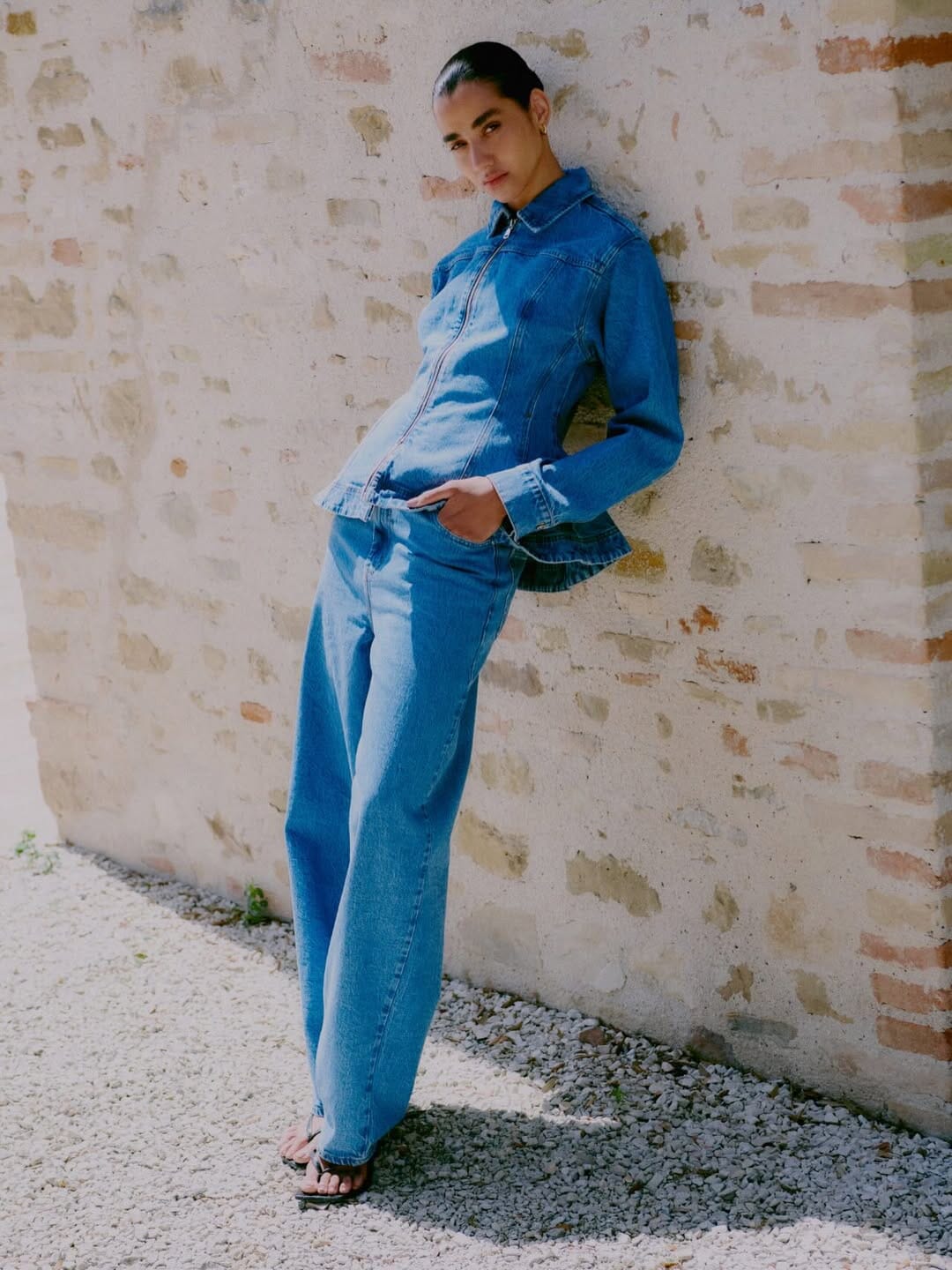 Jean Second Female en denim bleu, confectionné en 100 % coton. Le jean présente une taille mi-haute et des jambes barrel avec une coupe ample. Longueur cheville avec design classique à cinq poches.