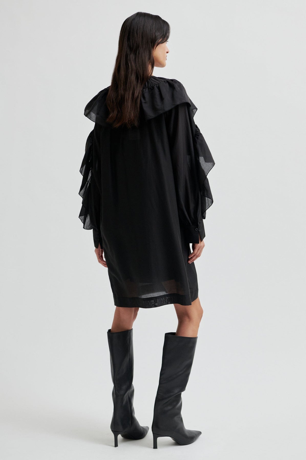 Robe noire Second Female avec détails de volants diagonaux au niveau de l’encolure et des manches. La robe présente une coupe ample et est confectionnée dans une matière légère et semi-transparente.