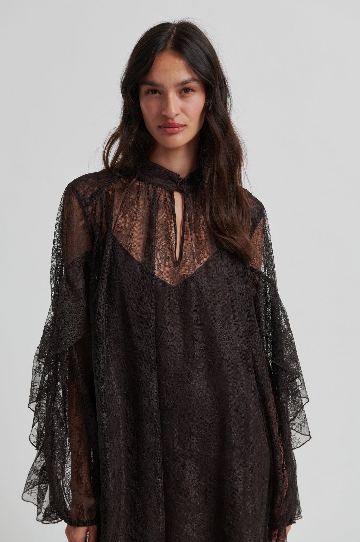 Robe en dentelle de Second Female de couleur brun chocolat. La robe est confectionnée dans un tissu en dentelle transparent avec un motif floral et convient aux occasions festives et formelles.