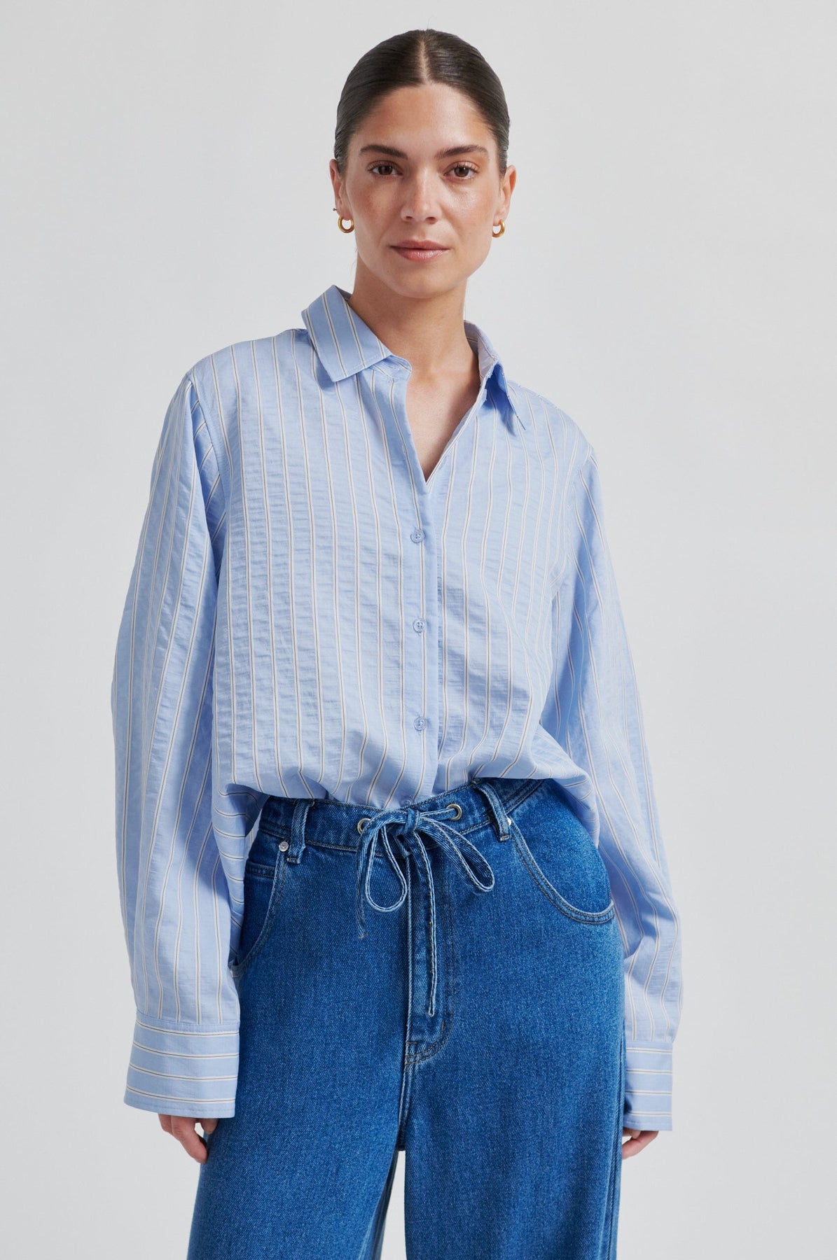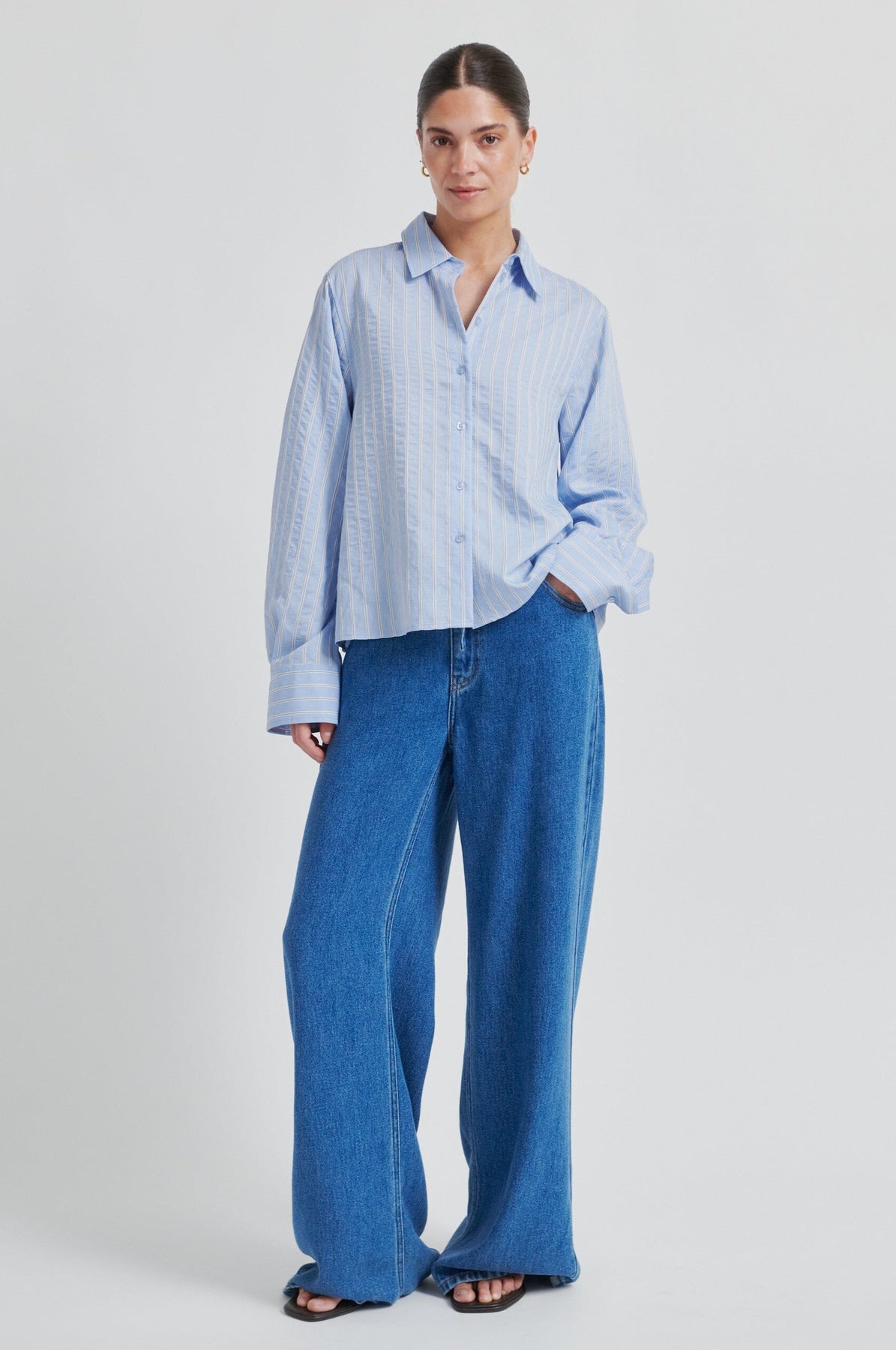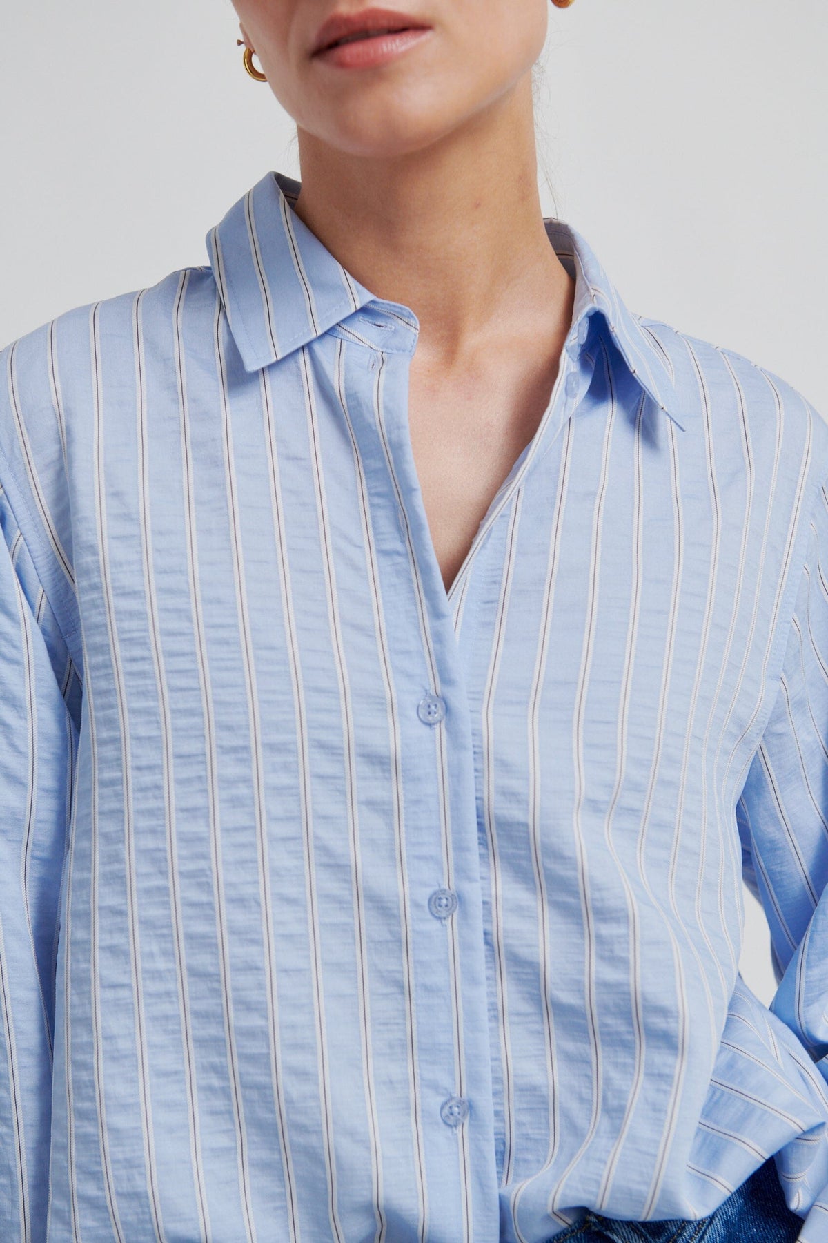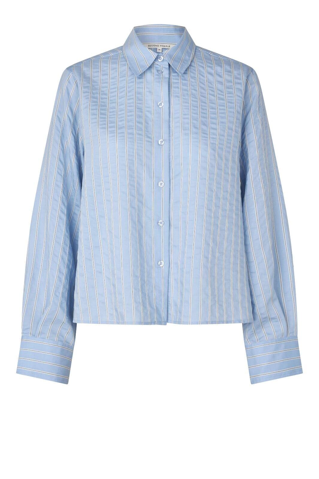 Chemise bleu clair à rayures blanches de Second Female. La chemise est confectionnée dans un mélange doux contenant 72% de viscose et présente une coupe courte et ample.