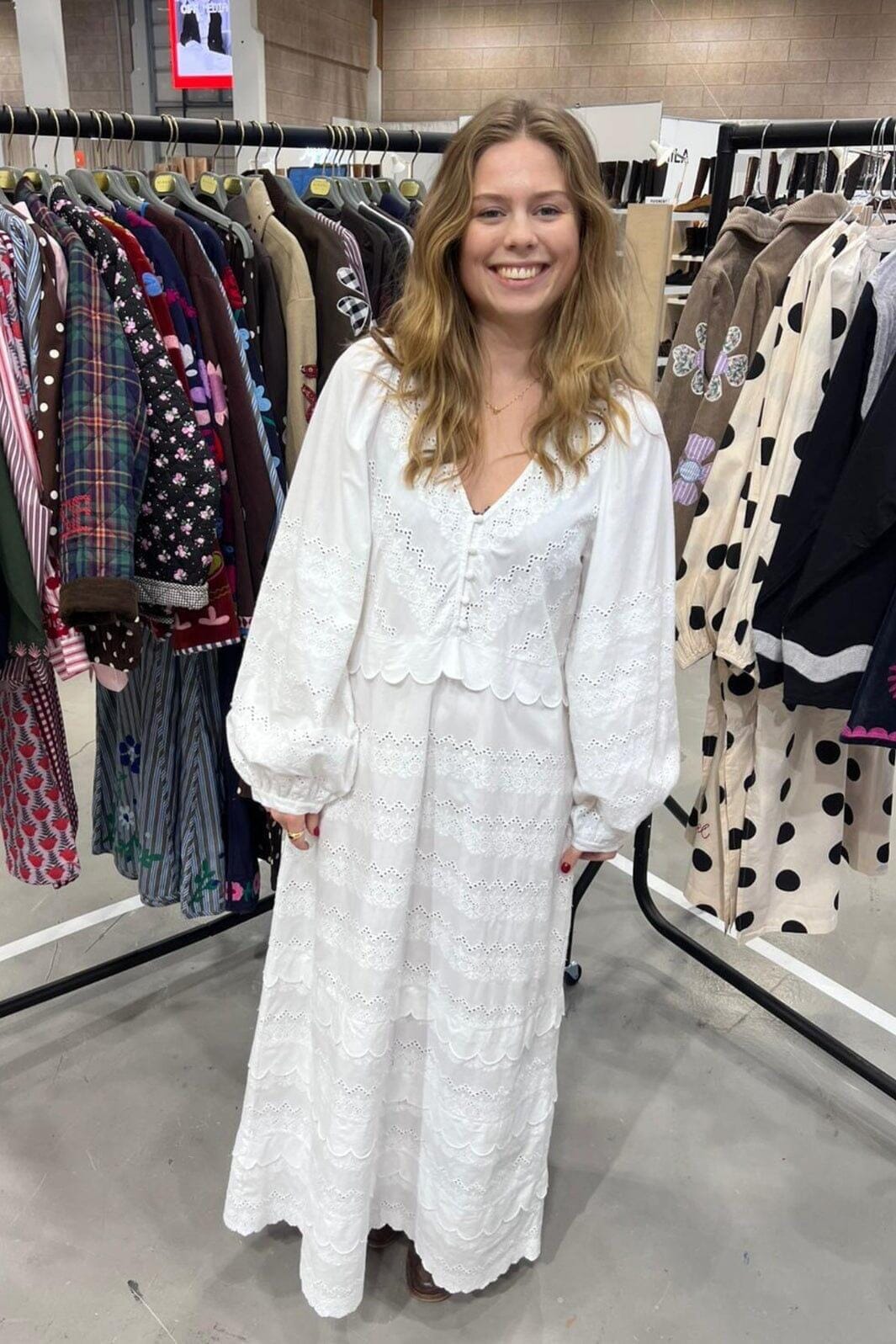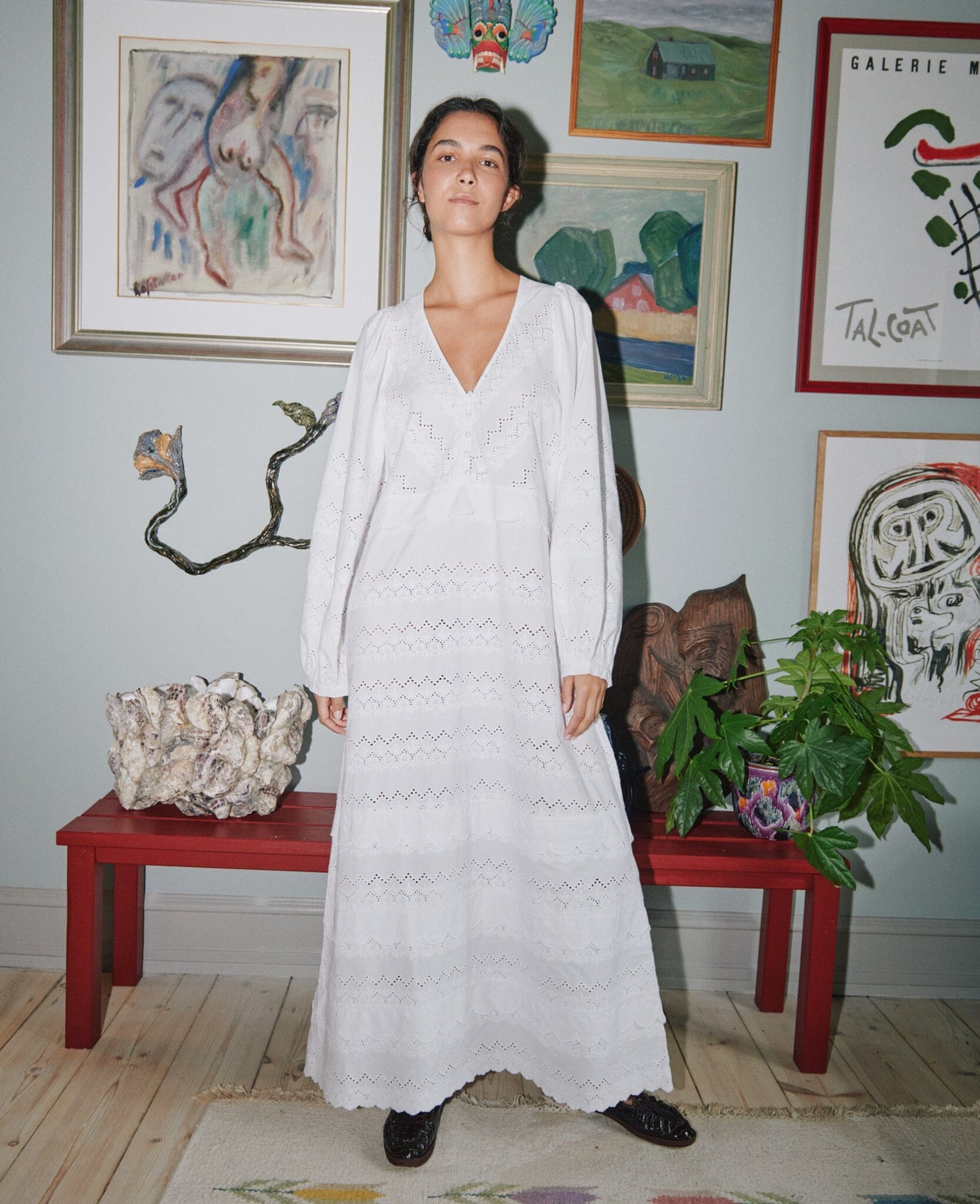 Robe de Sissel Edelbo en off-white. Fabriquée en tissu broderie anglaise avec des trous brodés. La robe a un décolleté en V profond et des manches longues.