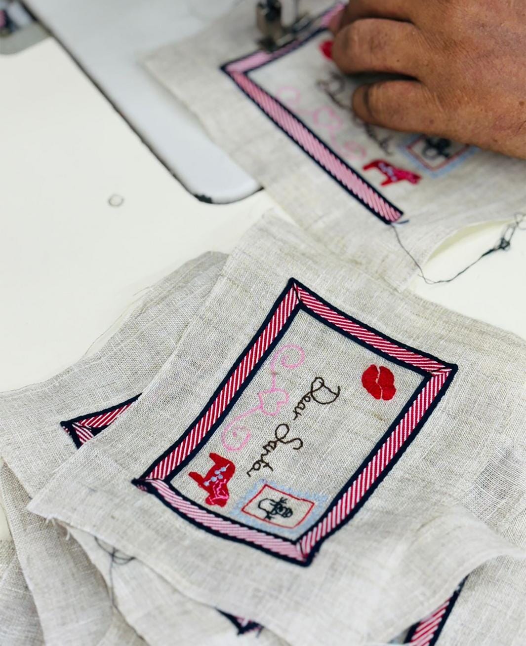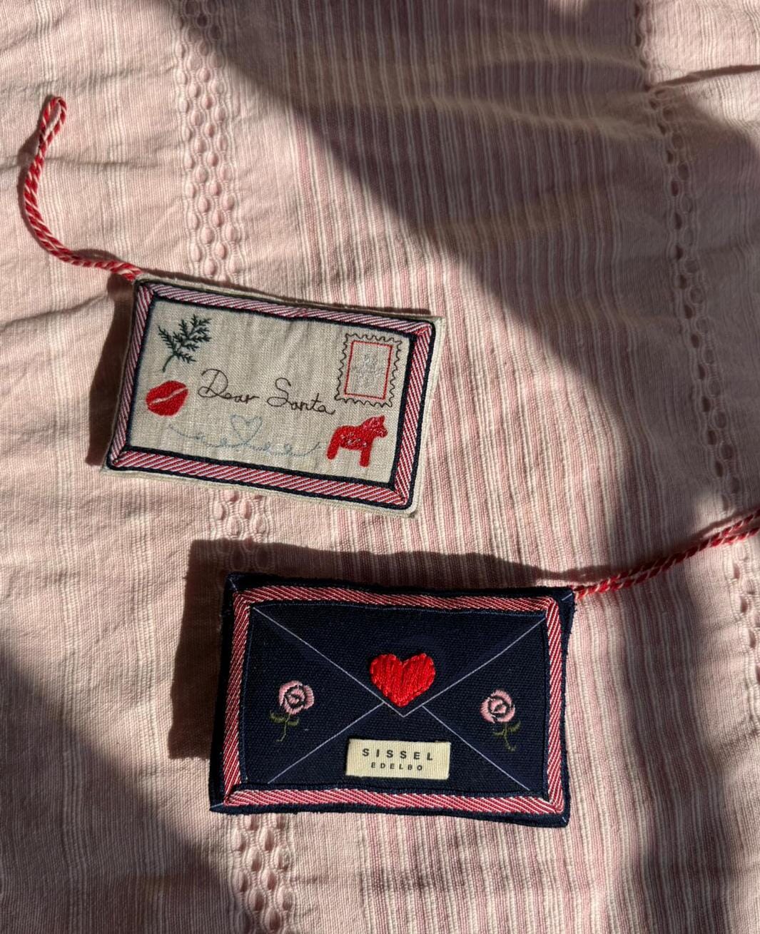 Ornement de Noël de Sissel Edelbo, fabriqué en lin dans une nuance beige. L'ornement a un texte brodé et des décorations sur le thème de Noël.
