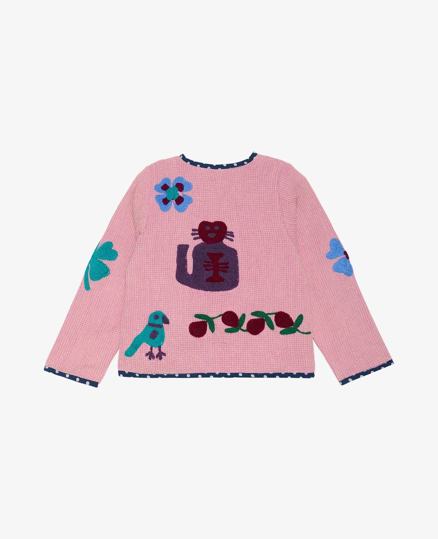 Veste rose de Sissel Edelbo avec broderie Suzani faite à la main. La veste a un motif à pois à l'avant et trois ensembles de liens le long de l'avant. Elle est fabriquée en coton biologique avec une texture gaufrée.
