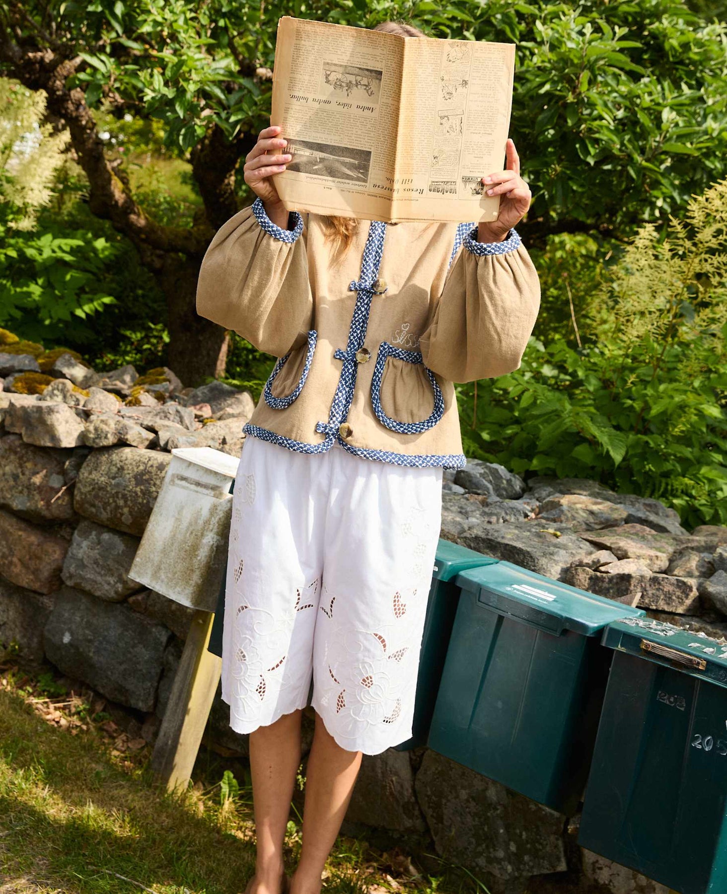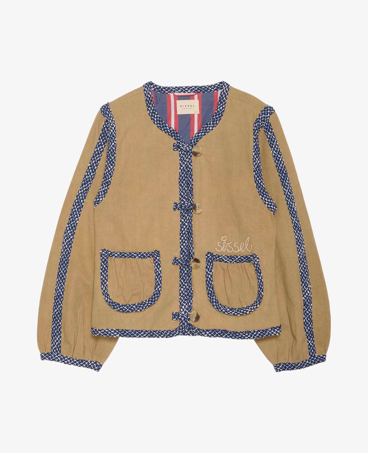 Veste de Sissel Edelbo en sergé de coton couleur sable avec des bordures en bouclé bleu à motifs le long du col, des manches et des poches.