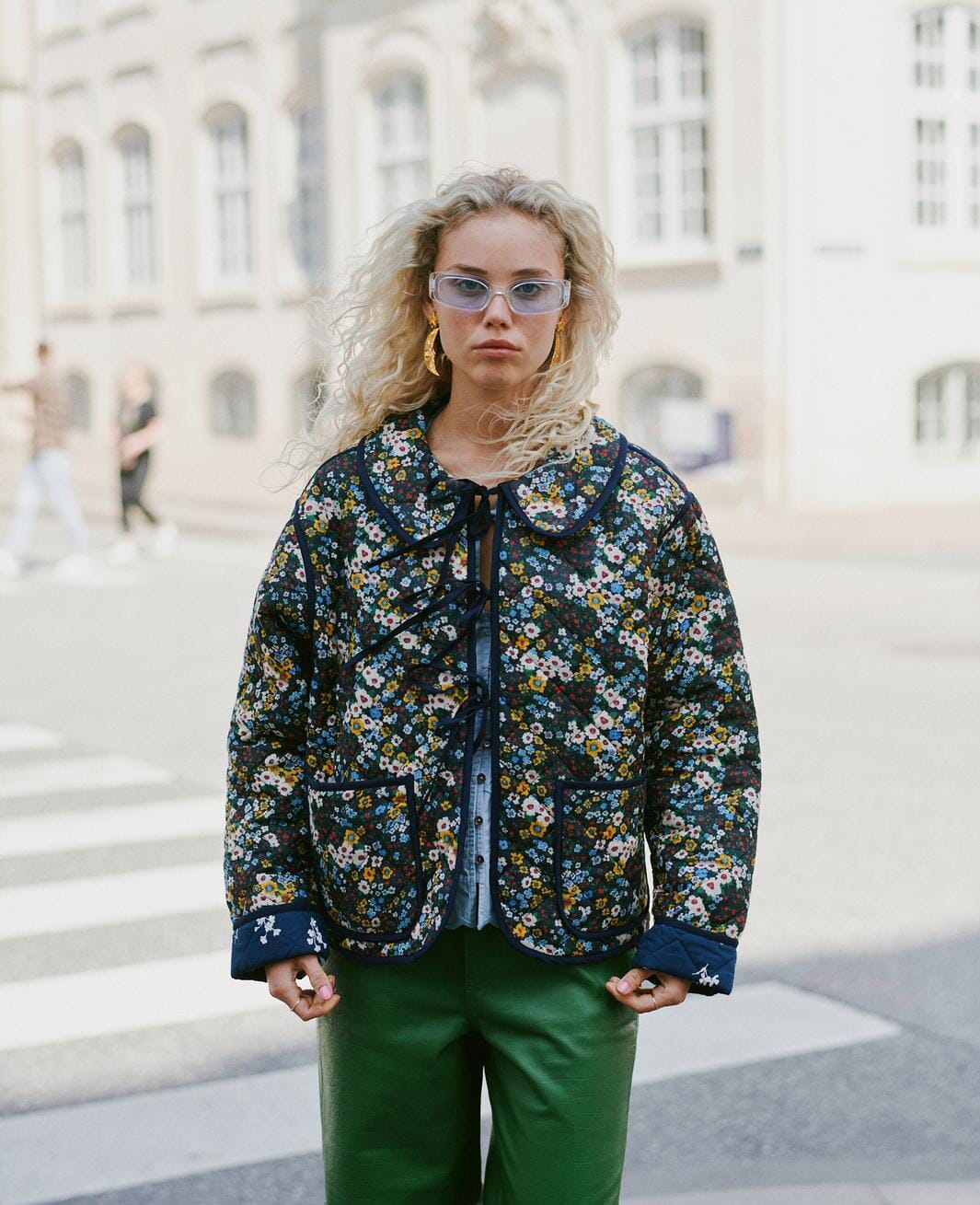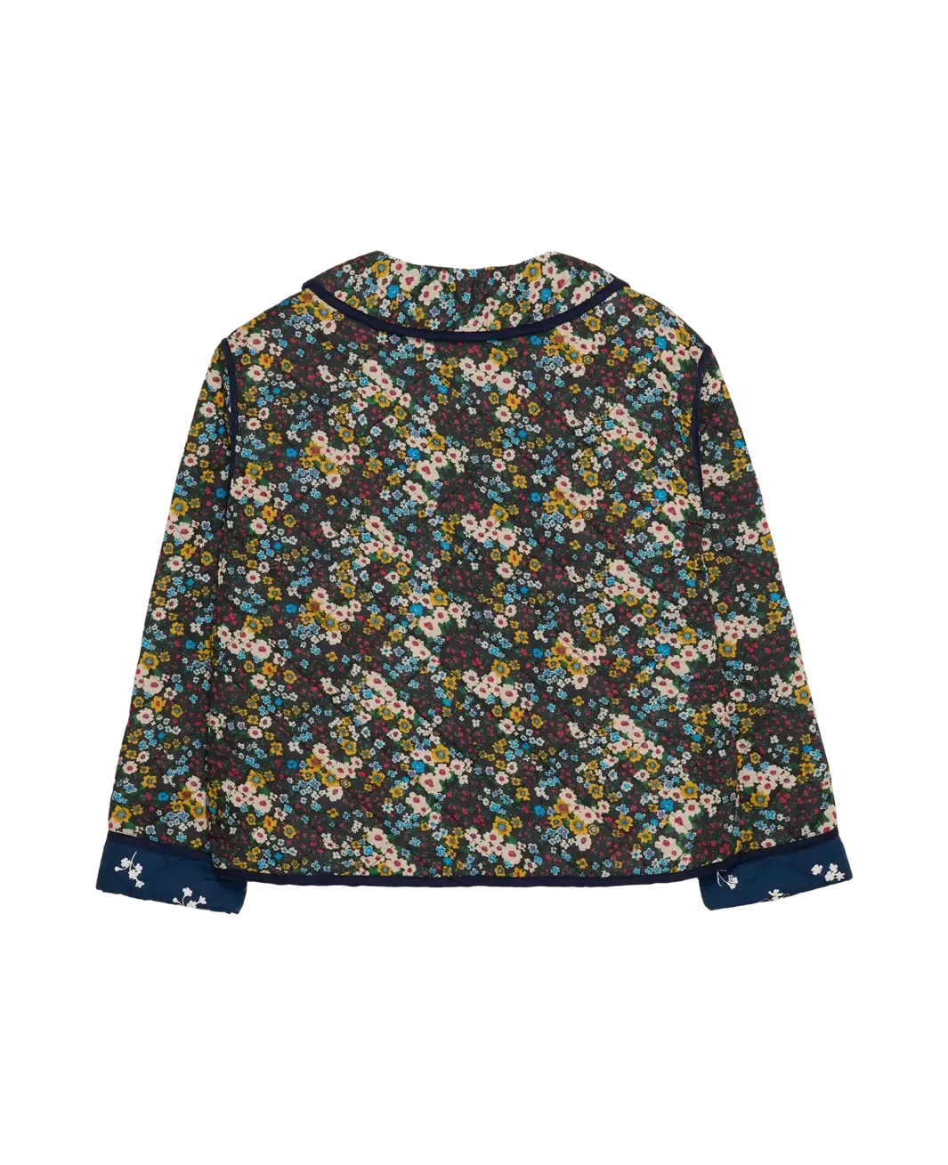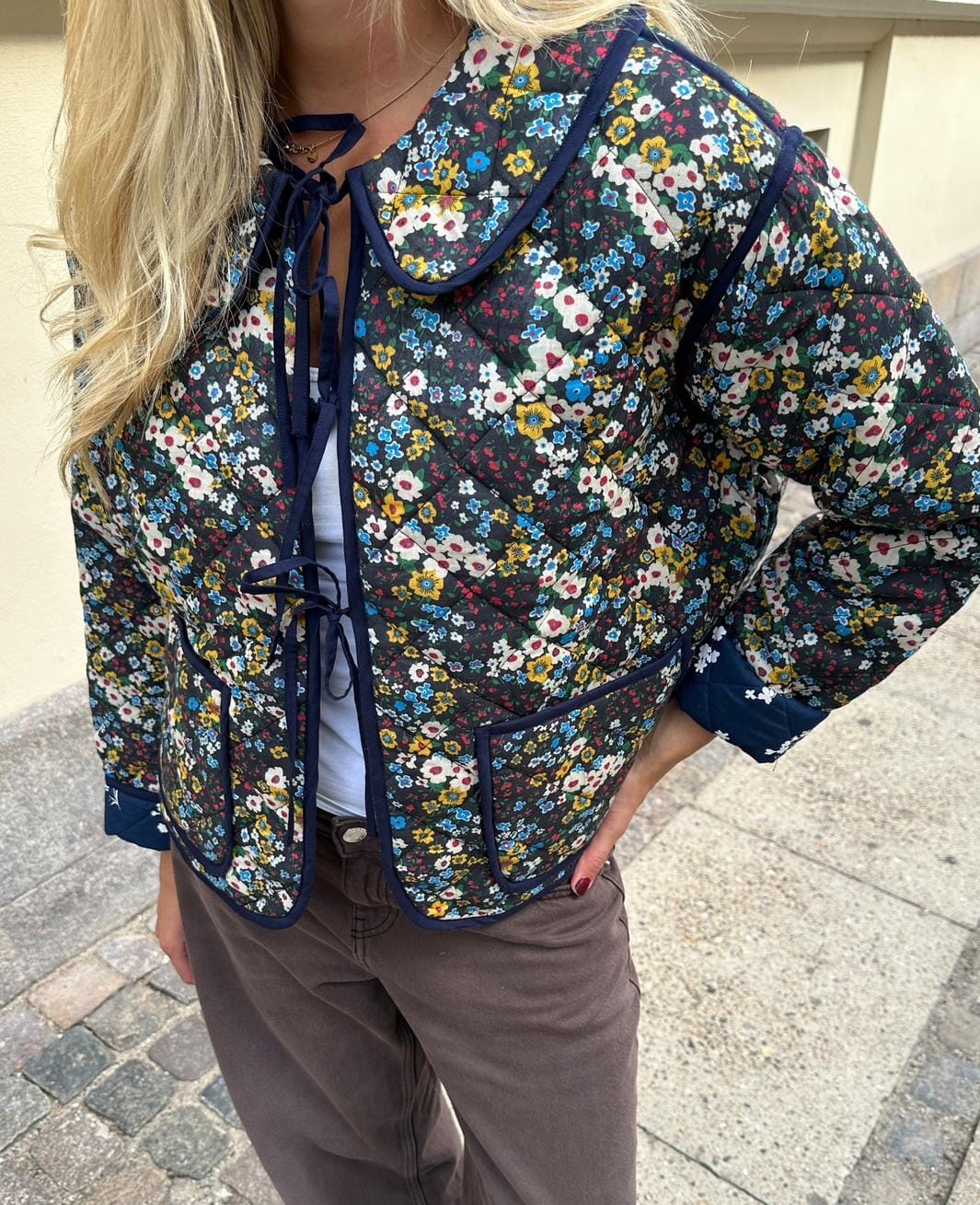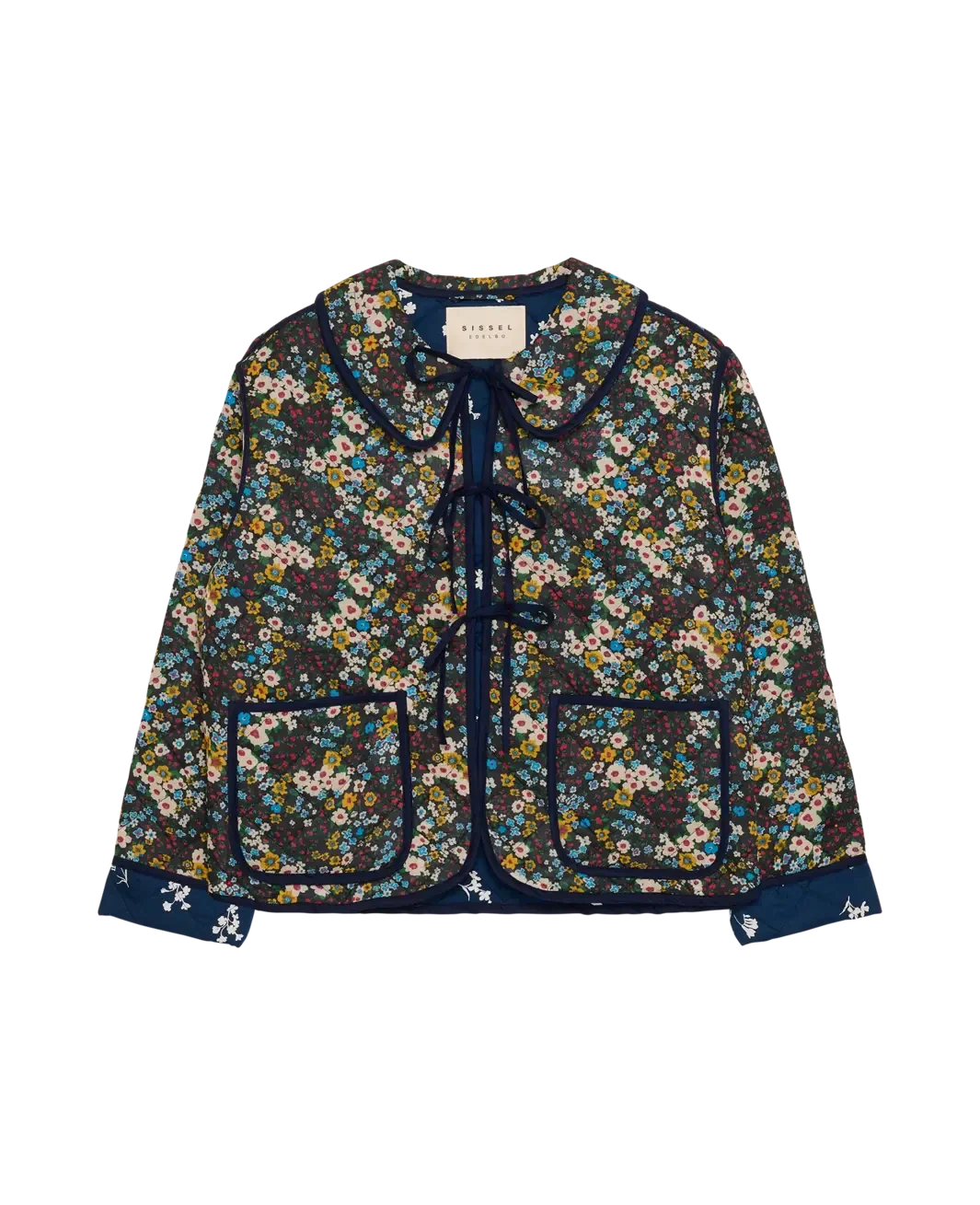 Veste matelassée de Sissel Edelbo avec un motif floral sur fond sombre. La veste a un large col Peter Pan et trois jeux de liens à l'avant pour la fermeture.