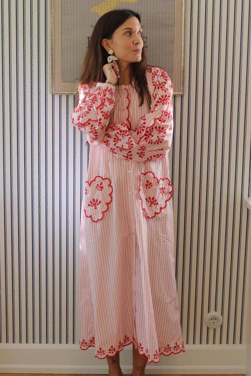 Robe rayée Sissel Edelbo rouge et blanche. La robe est fabriquée en 100 % coton biologique avec broderies et coutures décoratives.