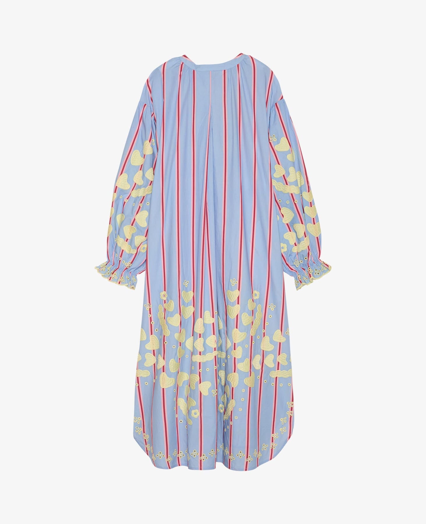 Robe de Sissel Edelbo avec fond bleu clair et rayures verticales rouges. La robe présente des cœurs et des fleurs brodés en vert clair sur le devant, les manches et le bas.