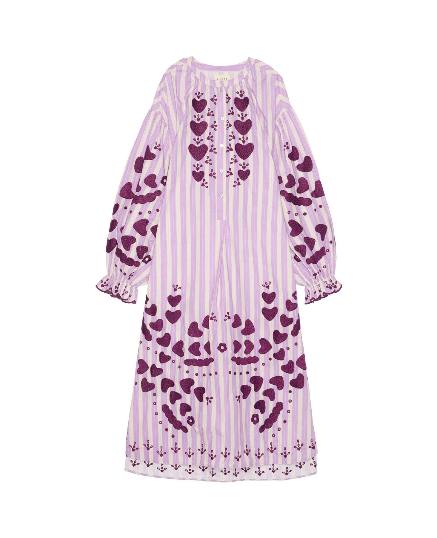 Robe rayée de Sissel Edelbo en violet et blanc avec broderies de cœurs et de fleurs violet foncé. La robe présente des rayures teintes en fil et est confectionnée en coton biologique.