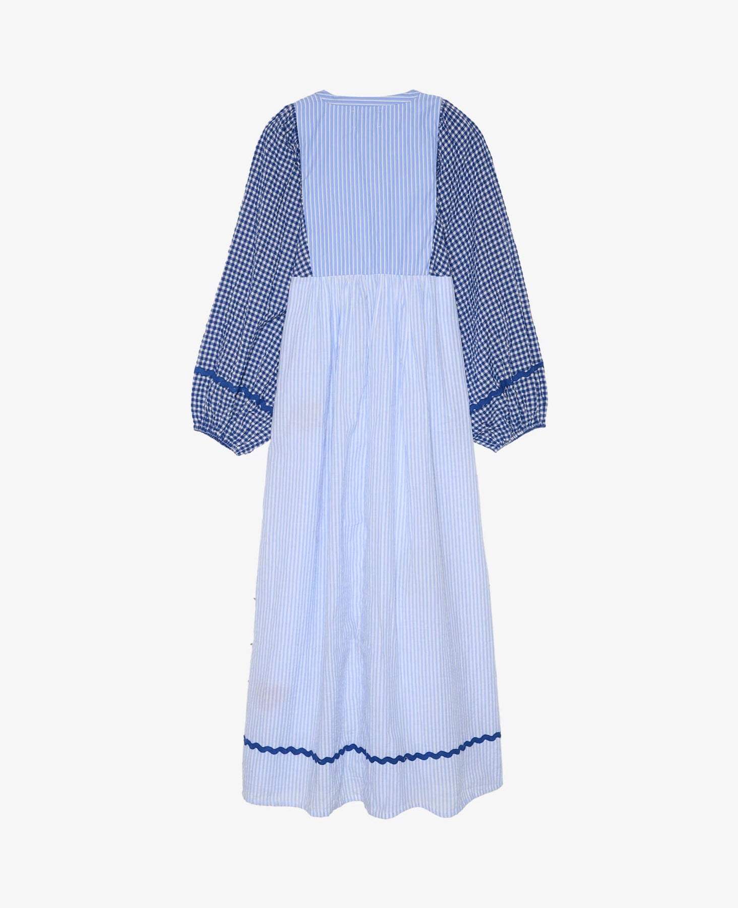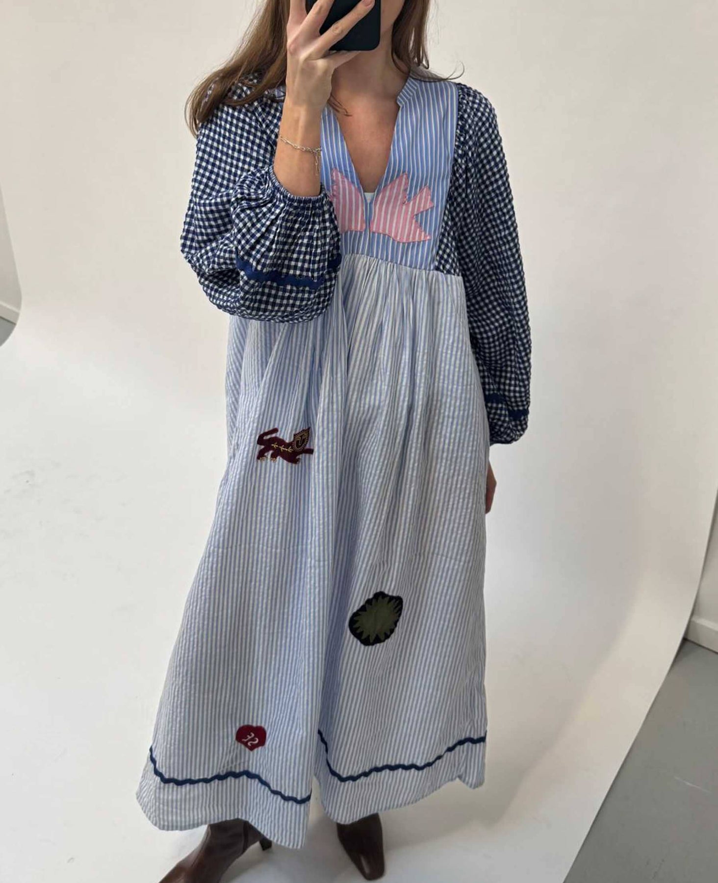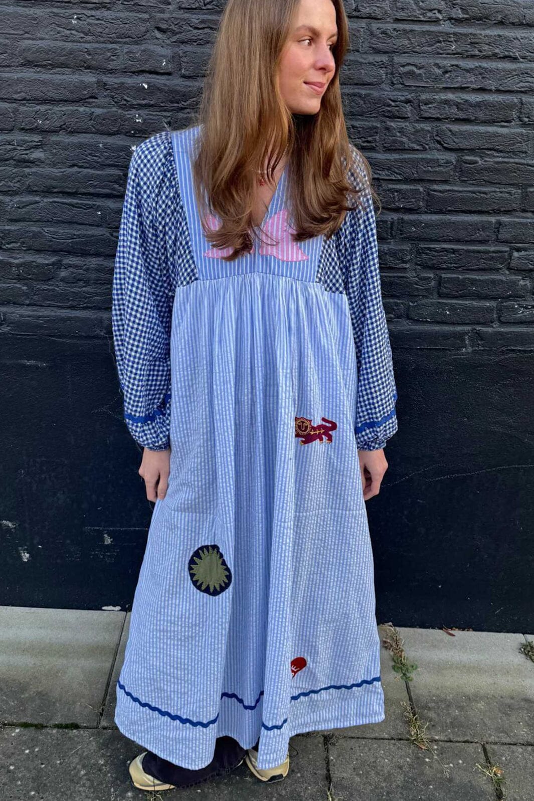 Robe de Sissel Edelbo confectionnée à partir de tissus excédentaires en blanc et bleu. Elle présente un motif multicolore avec des rayures, des carreaux et des empiècements décoratifs.