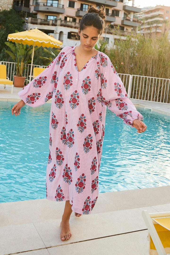 Robe de Sissel Edelbo avec impression sérigraphiée faite à la main en rose et rouge sur fond blanc. Elle a un décolleté en V, des manches ballon et une coupe ample avec des fentes sur les côtés.