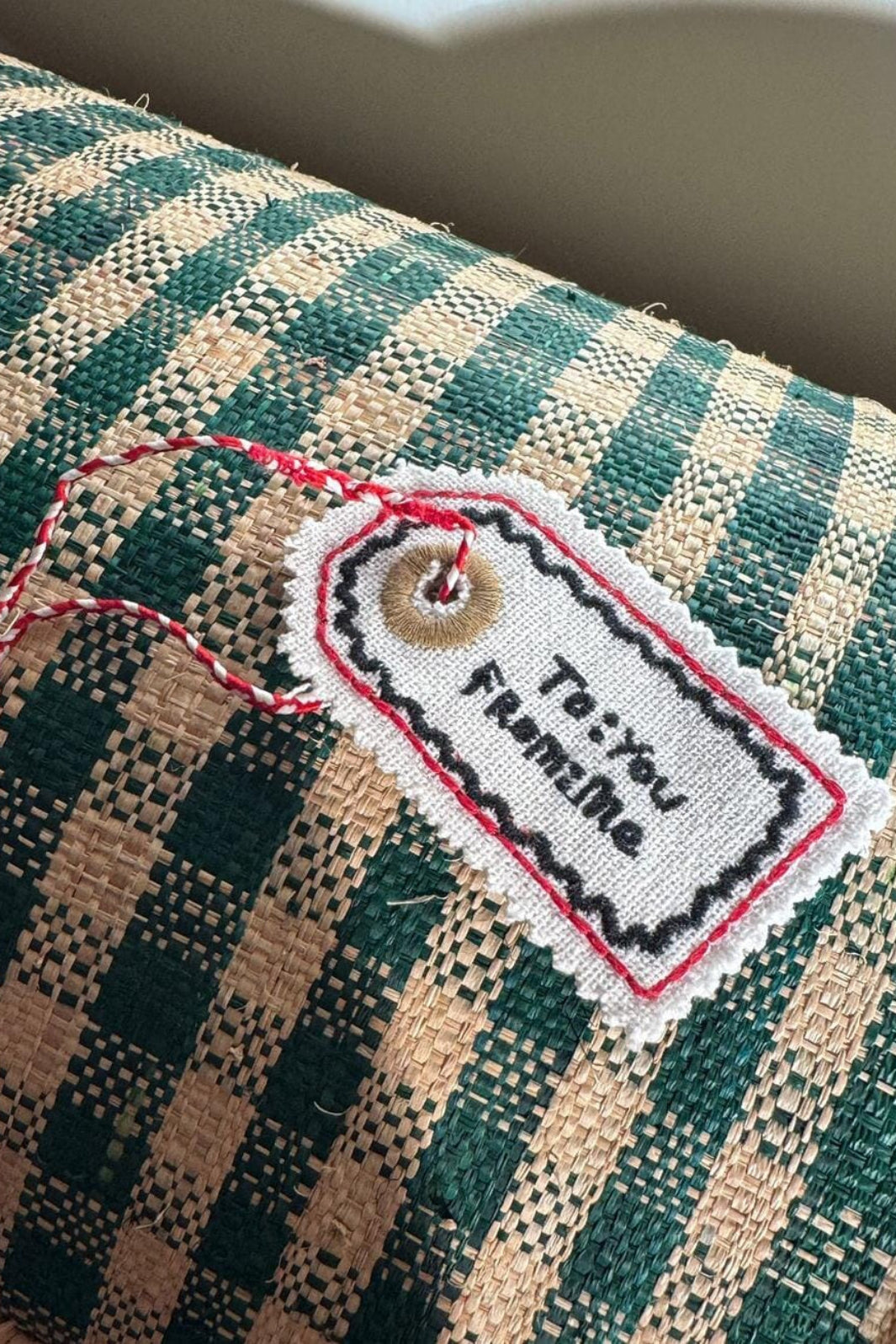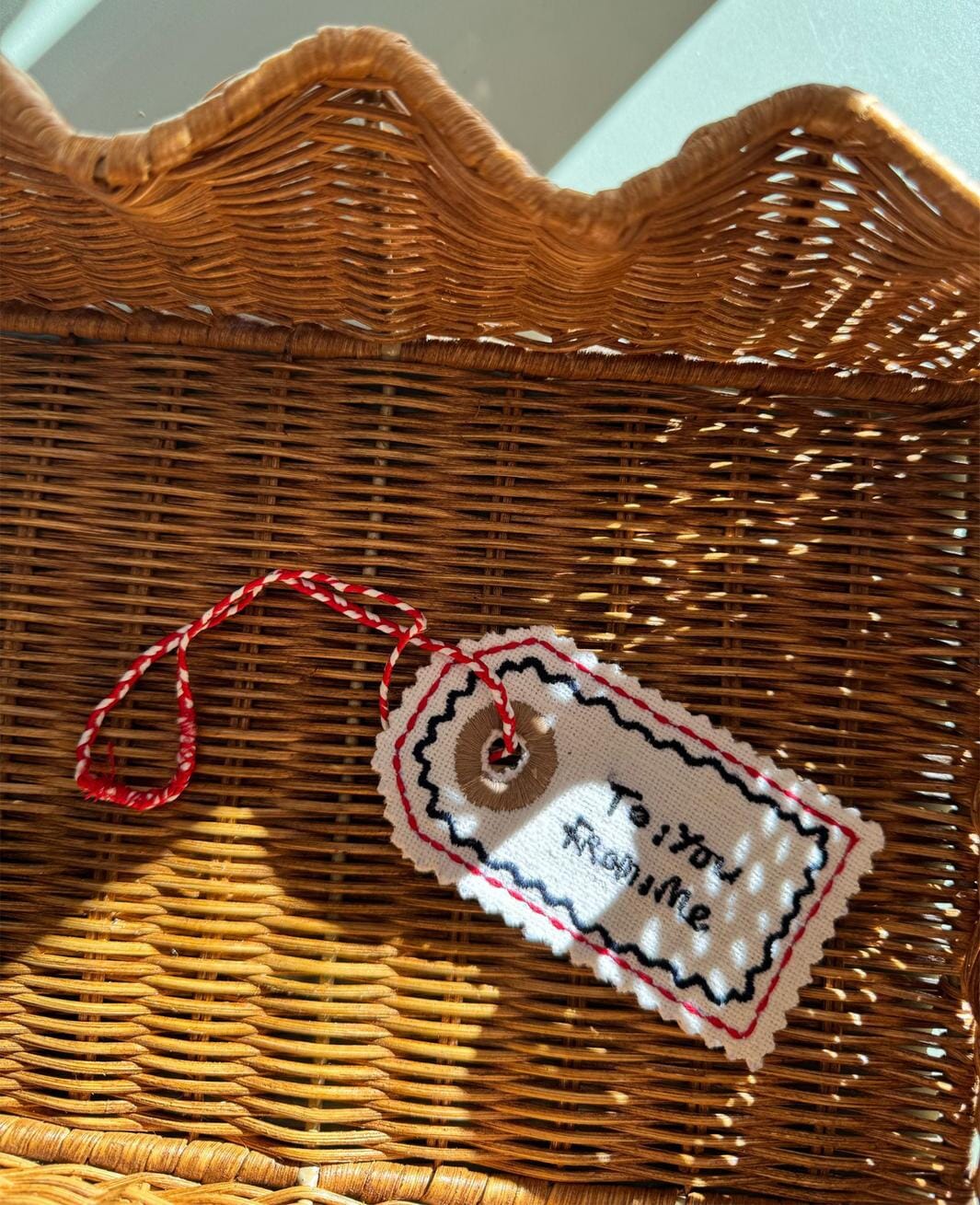 Un ornement de tag de Sissel Edelbo, fabriqué à partir de tissu bouclé tweed excédentaire. L'ornement est rectangulaire avec des bords en scallop et une corde tressée rouge/blanche.