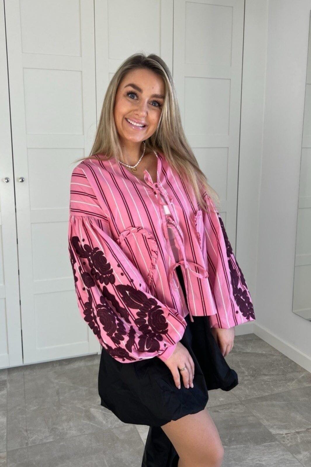 Top rayé de Sissel Edelbo en coton biologique. Le top rose a des motifs floraux bordeaux sur les manches et trois ensembles de liens à l'avant.